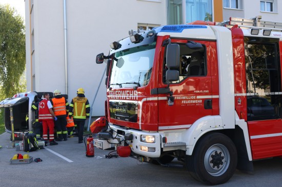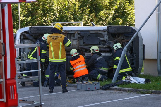 Wels. Die Feuerwehr wurde am späten Dienstagnachmittag gemeinsam mit dem Rettungsdienst und der Polizei zu einem Unfall auf dem Parkplatz eines Mehrparteienwohnhauses in Wels-Vogelweide alarmiert.
