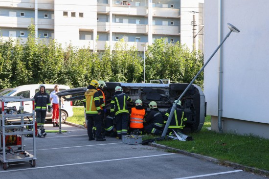 Eine Autolenkerin war bei einem Parkmanöver aus noch unbekannter Ursache verunfallt. Der PKW krachte gegen einen Lichtmast und stürzte dann um. Das Fahrzeug kam in Seitenlage zum Stillstand. Die Feuerwehr wurde zur Personenrettung alarmiert. Die Lenkerin befand sich beim Eintreffen der Einsatzkräfte noch im umgestürzten Fahrzeug. Sie wurde von den Einsatzkräften durch den Kofferraum des Fahrzeuges aus dem Fahrzeug befreit und in weiterer Folge vor Ort vom Rettungsdienst versorgt. Ein Transport ins Klinikum war dann zum Glück nicht notwendig. Die Frau überstand den Unfall mit einem leichten Schock. Nach Abschluss der Personenrettung wurde seitens der Polizei ein Abschleppdienst avisiert. Techniker des Notdienstes der Wohnunggenossenschaft klemmten den betroffenen Lichtmast ab.