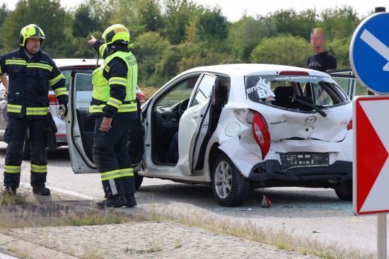 Drei Fahrzeuge waren auf der Welser Straße in Fahrtrichtung Gunskirchen unterwegs, als es vor einer Abbiegespur beziehungsweise der davor befindlichen Querungshilfe zu einem Auffahrunfall kam. Das mittlere Auto wurde dabei schwer beschädigt. Die Einsatzkräfte der Feuerwehr wurden zur Personenrettung einer eingeschlossenen Person alarmiert. Die Türe konnte dann von den eintreffenden Feuerwehrkräften mit etwas Kraftaufwand geöffnet werden. Die Kräfte der Feuerwehr unterstützten die Notärztin, Sanitäterinnen und Sanitäter bei der Rettung der betroffenen Person aus dem PKW. In weiterer Folge wurde die Person ins Klinikum Wels eingeliefert. Die Feuerwehr führte anschließend die Aufräumarbeiten an der Unfallstelle durch.