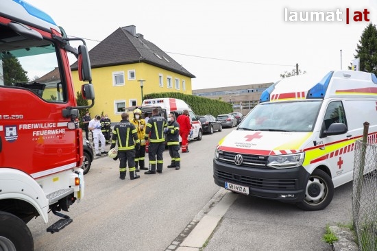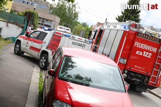 Einsatzkräfte von Feuerwehr, Rettungsdienst, Notarzt und Polizei standen Freitagnachmittag in Wels-Innenstadt bei einer Rettung einer Person aus einem leeren Pool im Garten eines Hauses im Einsatz.