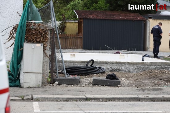Wels. Einsatzkräfte von Feuerwehr, Rettungsdienst, Notarzt und Polizei standen Freitagnachmittag in Wels-Innenstadt bei einer Rettung einer Person aus einem leeren Pool im Garten eines Hauses im Einsatz.