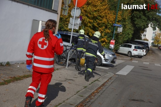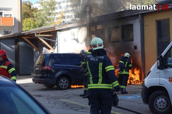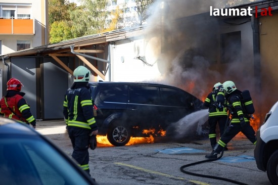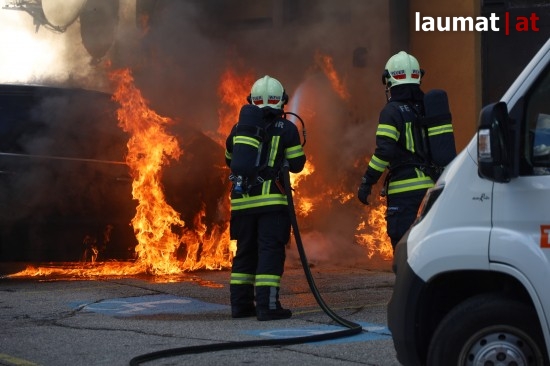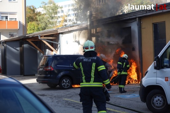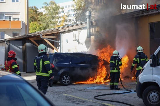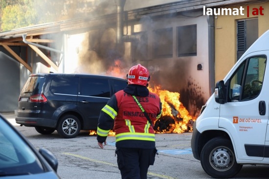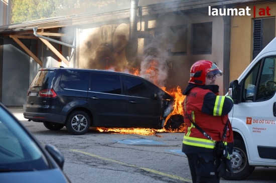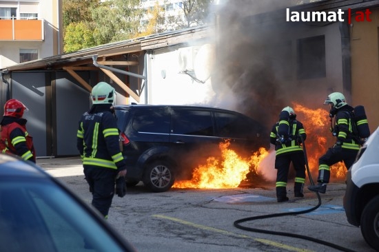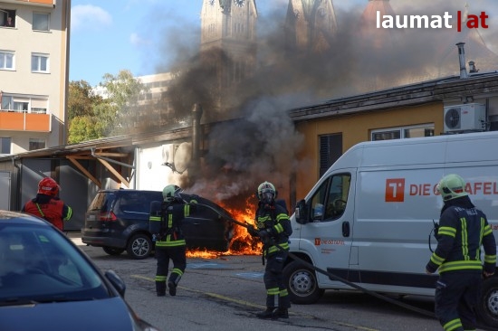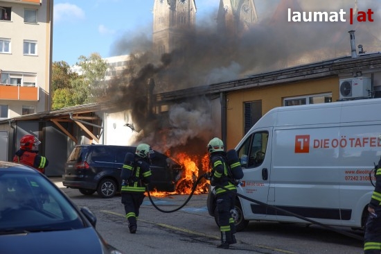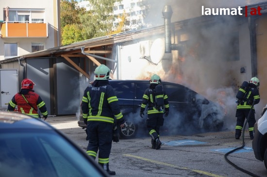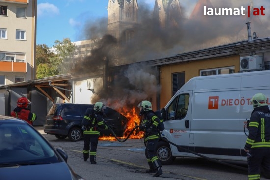 PKW in Vollbrand: Löscheinsatz der Feuerwehr samt Personenrettung in Wels-Neustadt