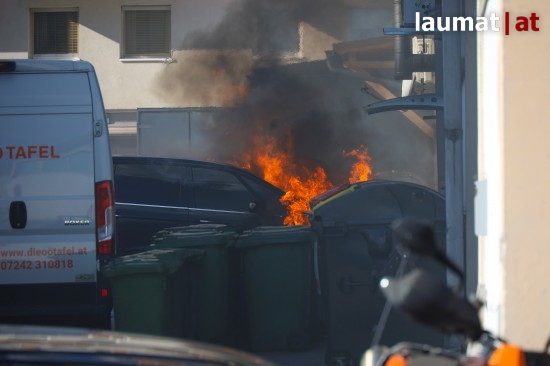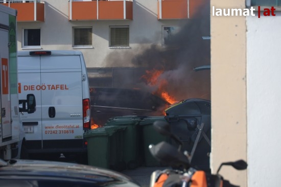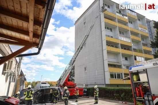 Ein PKW ist Samstagmittag auf dem Parkplatz hinter einem Gebäude am Flotzingerplatz in Wels-Neustadt in Flammen aufgegangen. Im weiteren Verlauf des Einsatzes musste noch eine Person gerettet werden.