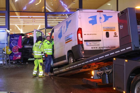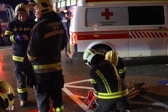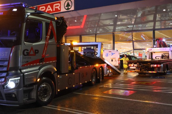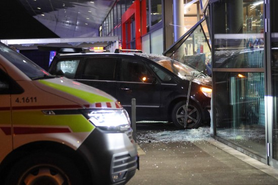 Reanimation, Frau verletzt: Transporter schiebt Auto in Wels-Vogelweide durch Geschäftsfassade