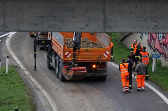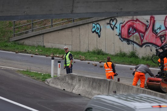 Einsatzkräfte der ASFINAG, der Feuerwehr und der Autobahnpolizei standen Donnerstagnachmittag auf der A8 Innkreisautobahn bei Wels im Einsatz, nachdem ein LKW einen Teil seiner Ladung verloren hatte.