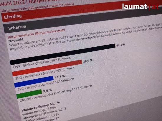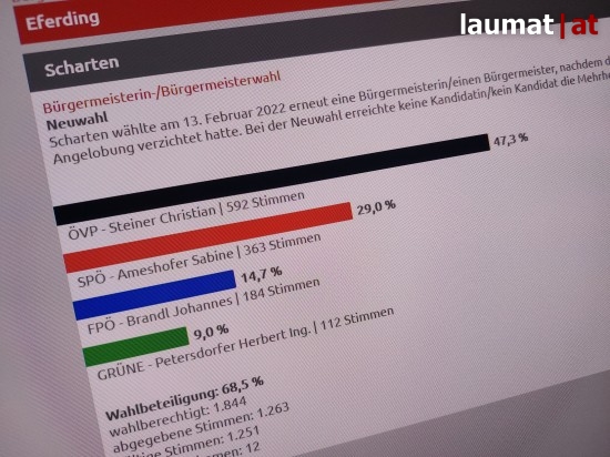 In Scharten (Bezirk Eferding) waren am Sonntag 1.844 Einwohnerinnen beziehungsweise Einwohner zur Wahl der Bürgermeisterin beziehungsweise des Bürgermeisters aufgerufen.