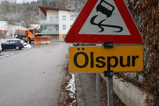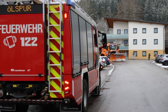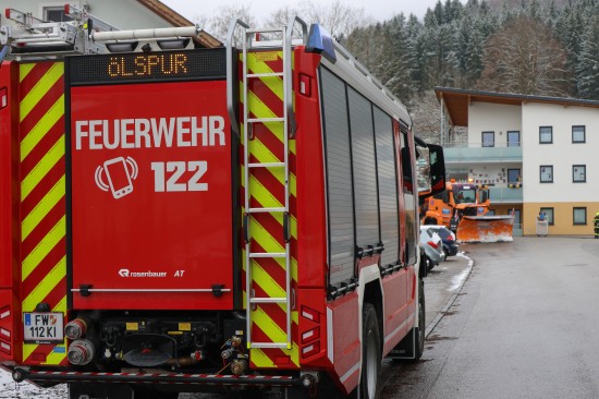 Die Einsatzkräfte wurden auf die L1326 Leonsteiner Straße, Badstraße beziehungsweise Hambaumstraße im Ortszentrum von Leonstein, im Gemeindegebiet von Grünburg alarmiert, nachdem ein Schneepflug dort aufgrund eines Defektes auf mehreren Kilometern Hydrauliköl verloren hatte. Die Feuerwehr rief Alarmstufe 2 aus, fünf umliegende Wehren standen dann mit Bindearbeiten im Einsatz. Unterstützt wurden die Arbeiten von einer Kehrmaschine des betroffenen Unternehmens. Der Pannendienst des Unternehmens war ebenso vor Ort, um das Problem am Fahrzeug zu beheben.