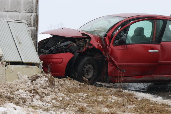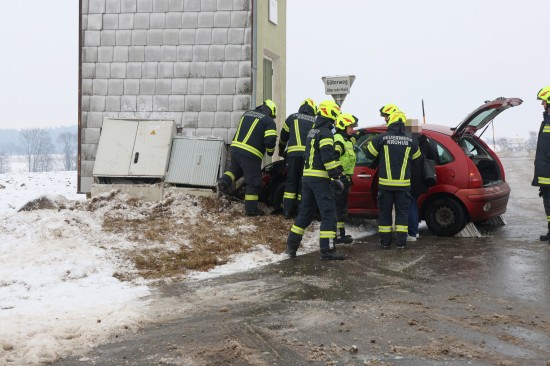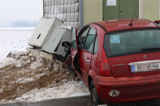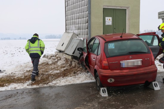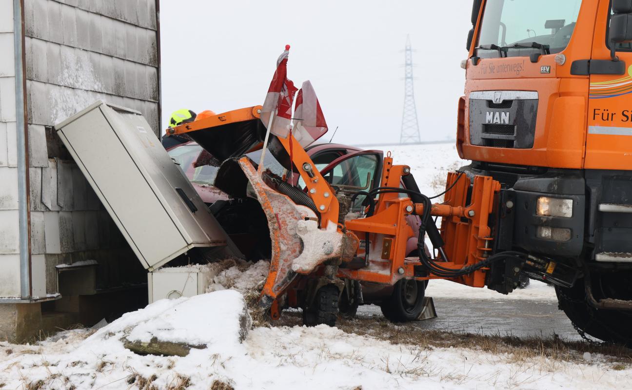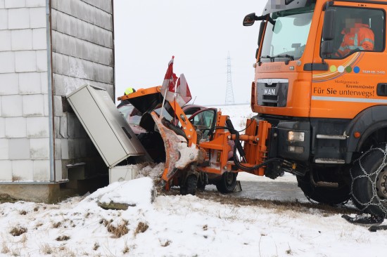 Schneepflug und Auto nach Kreuzungskollision in Kremsmünster gegen Trafostation gekracht