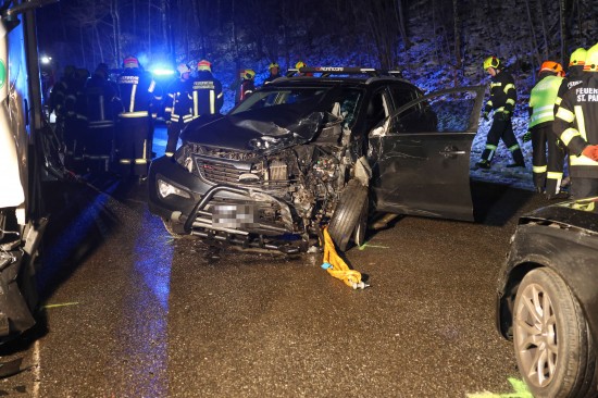 St. Pankraz. Eine schwerverletzte Person forderte am Donnerstag in den frühen Morgenstunden ein Unfall mit zwei beteiligten PKW, einem Kleintransporter und einem LKW-Sattelzug auf der B138 Pyhrnpass Straße bei St. Pankraz (Bezirk Kirchdorf an der Krems).