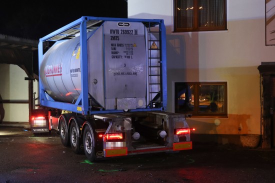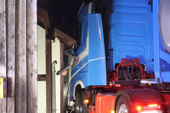 Schwerer Kreuzungscrash: LKW nach Unfall auf Salzkammergutstraße bei Regau gegen Wohnhaus gekracht