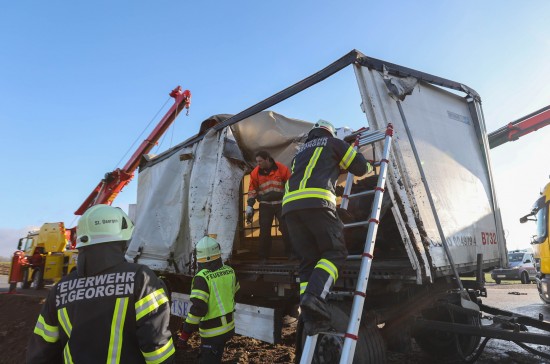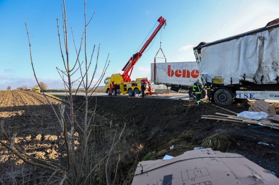 St. Georgen bei Obernberg am Inn. Ein schwerer LKW-Unfall hat sich Montagfrüh auf der Altheimer Straße auf Höhe der Ortschaft Krautsdorf in St. Georgen bei Obernberg am Inn (Bezirk Ried im Innkreis) ereignet.