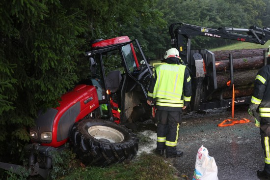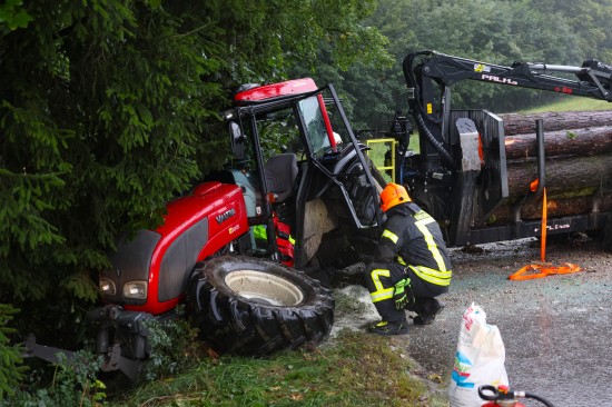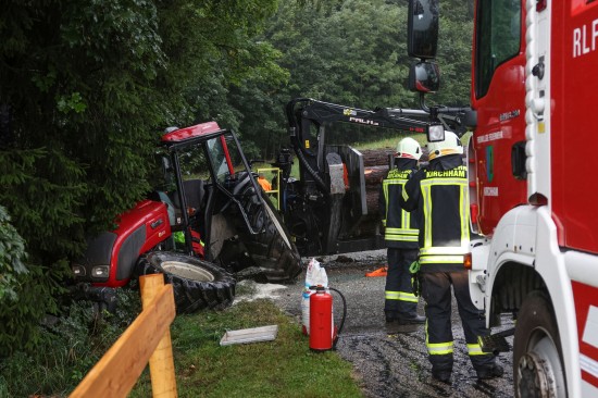 Schwerer Traktorunfall: Traktor mitsamt Holzrückewagen in Kirchham gegen Waldrand geprallt