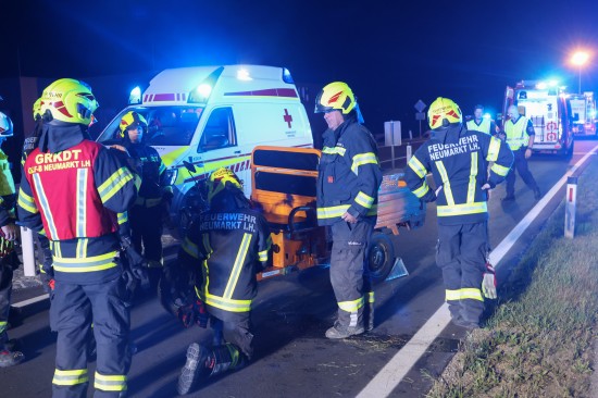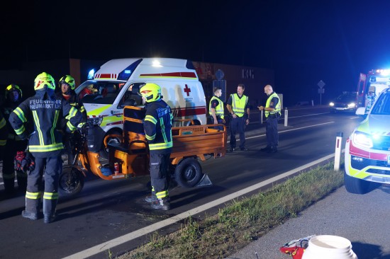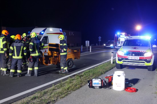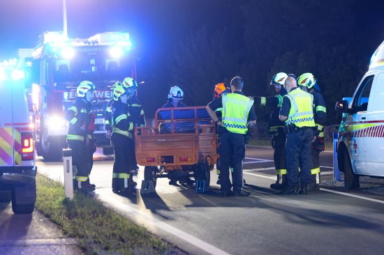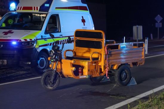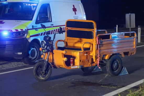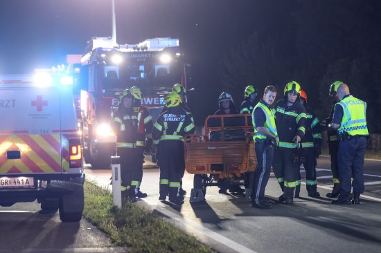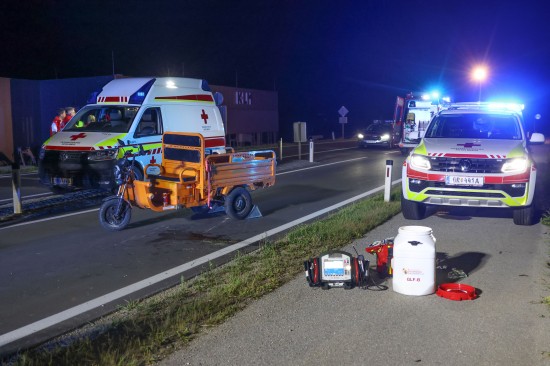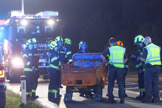 Neumarkt im Hausruckkreis. Die Einsatzkräfte zweier Feuerwehren, Rettung, Notarzt und die Polizei sind in der Nacht auf Donnerstag zu einer Personenrettung nach einem schweren Unfall mit einem Tuk-Tuk alarmiert worden.