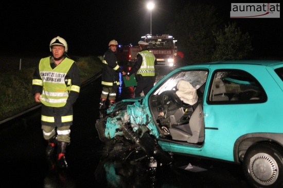 Ein 23-Jähriger lenkte seinen PKW auf der B134 von Eferding kommend in Richtung Breitenaich, als er aus bislang unbekannter Ursache auf die Gegenfahrbahn geriet und mit einem entgegenkommenden 19-Jährigen zusammenstieß. Dieser versuchte noch seinen PKW nach rechts verreißen, konnte einen Frontalzusammenstoß jedoch nicht mehr verhindern. Der Unfalllenker konnte das Fahrzeug erst verlassen, als die Türe entfernt wurde. Er wurde vom Notarztteam an der Unfallstelle erstversorgt und anschließend ins Klinikum Wels eingeliefert. Der Lenker des zweiten Fahrzeuges sowie seine Beifahrerin wurden leicht verletzt.