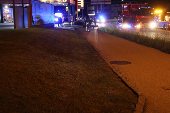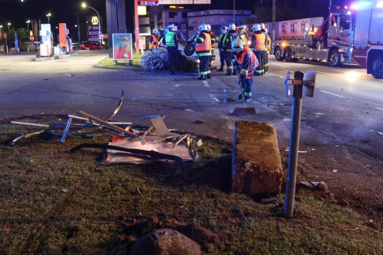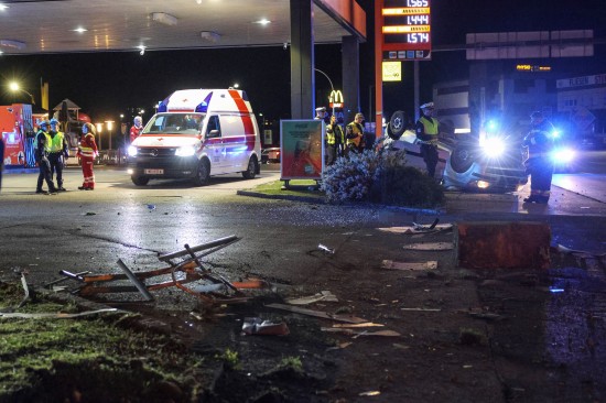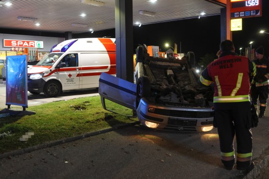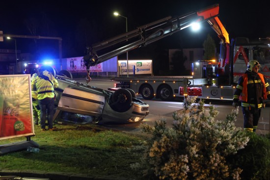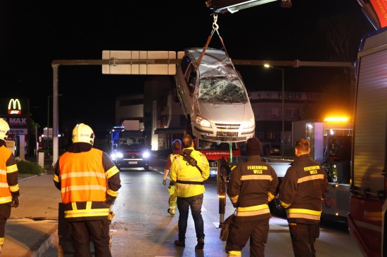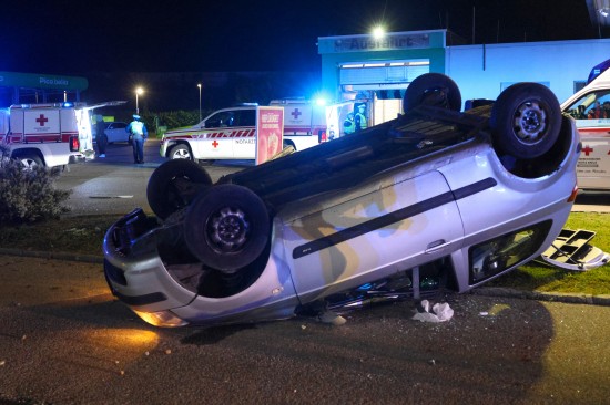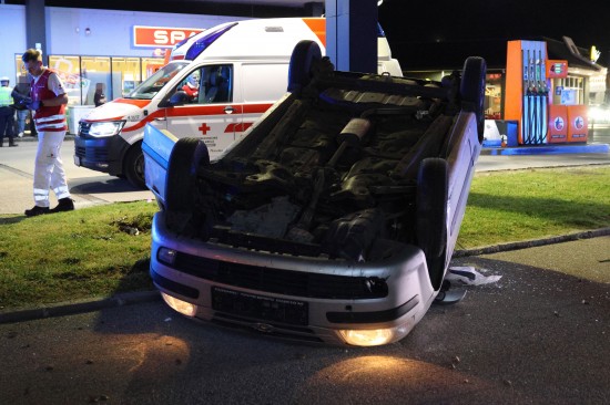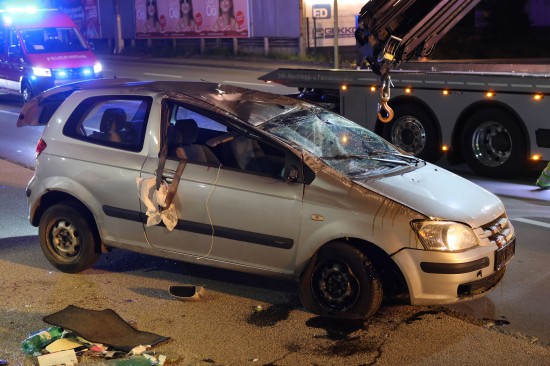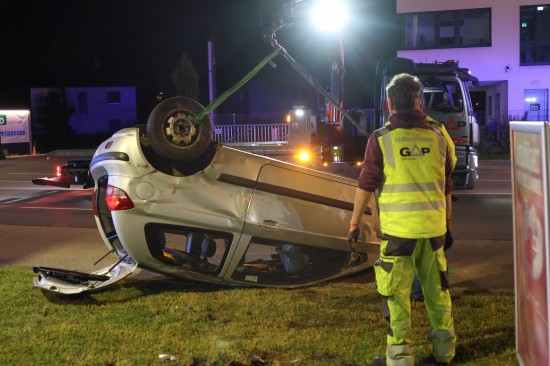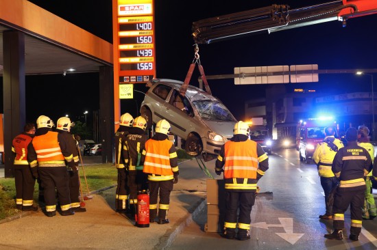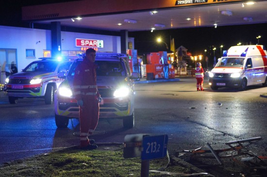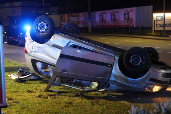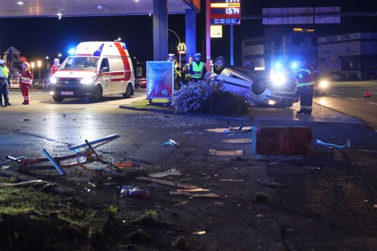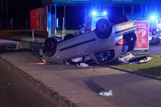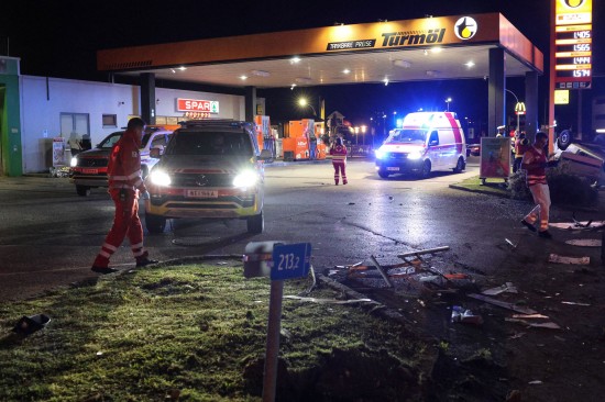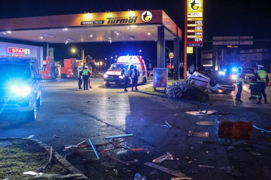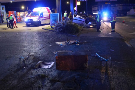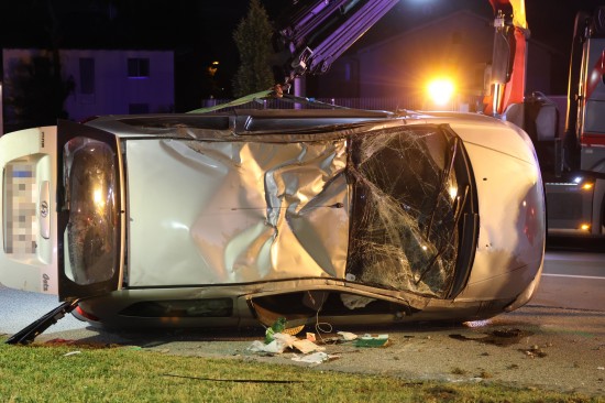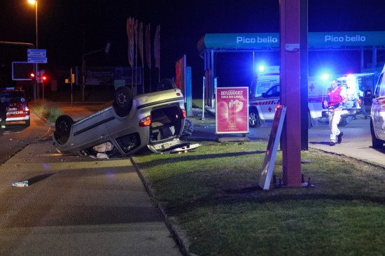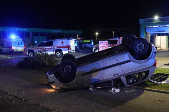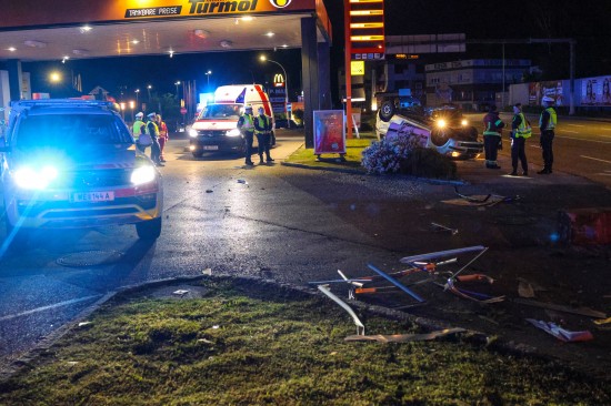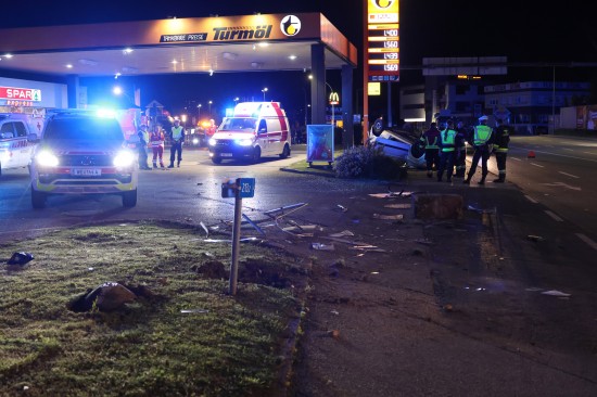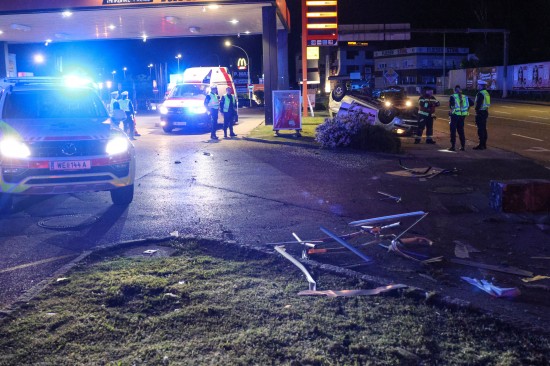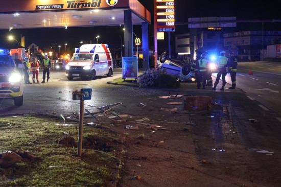 Der Unfall ereignete sich im Kreuzungsbereich der B1 Wiener Straße, Salzburger Straße mit der Noitzmühl- und Primelstraße im Welser Stadtteil Lichtenegg. Der genaue Unfallhergang war vorerst noch unbekannt. Ein Fahrzeug dürfte im dortigen Kreuzungsbereich jedoch offensichtlich dann auf den Geh- und Radweg und den dahinterliegenden Grünstreifen gelangt sein. Nach einer Kollision mit mehreren teils massiven Betonsockeln und einem Plakatständer hat sich das Fahrzeug dann offenbar heftig überschlagen und kam seitlich direkt neben einer Tankstelle am Dach liegend zum Stillstand. Augenzeugen eilten den eingeschlossenen Personen zu Hilfe. Die zwei Insassen konnten von Ersthelfern sofort aus dem Unfallwrack befreit und erstversorgt werden. Zwei Notarztteams versorgten die Verletzten, die dann in umliegende Krankenhäuser gebracht wurden. Ein Hund, der sich im Auto befunden hatte, wurde von Ersthelfern ebenfalls befreit und anschließend in eine Tierklinkik zur weiteren Versorgung gebracht. Die Feuerwehr wurde dann ebenso wie der Abschleppdienst zur PKW-Bergung alarmiert. Das Auto wurde vom Abschleppunternehmen wieder auf die Räder gestellt und aufgeladen. Die Feuerwehr band ausgelaufene Betriebsmittel und führte umfangreiche Aufräumarbeiten an der Unfallstelle durch.