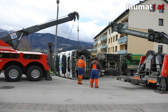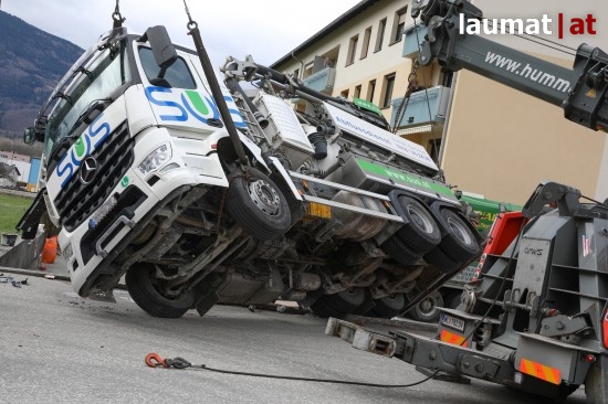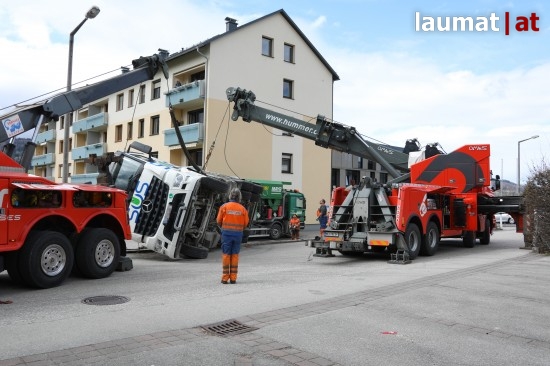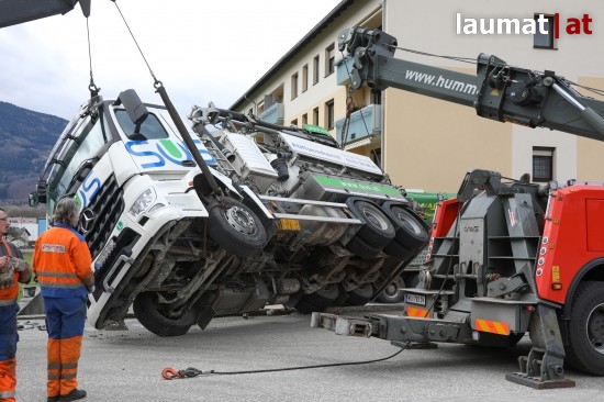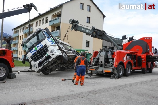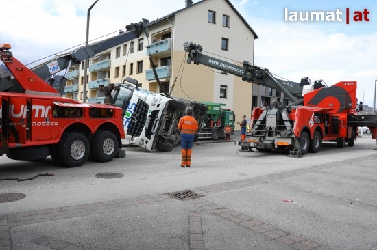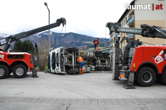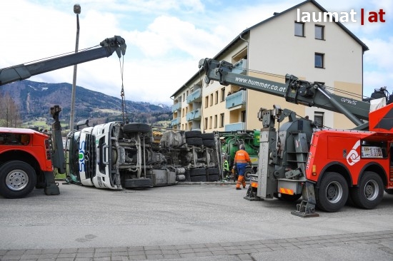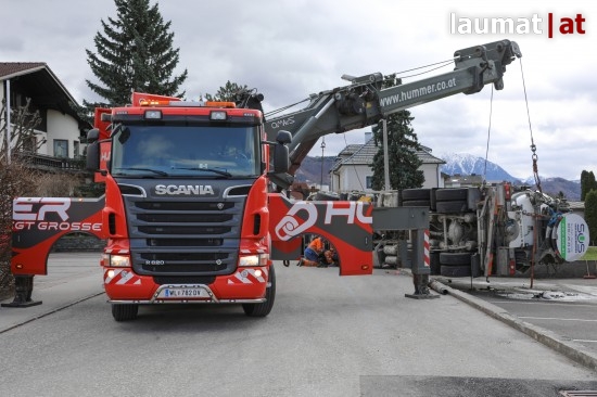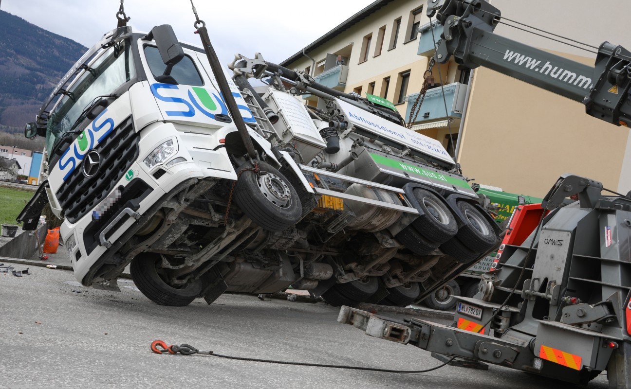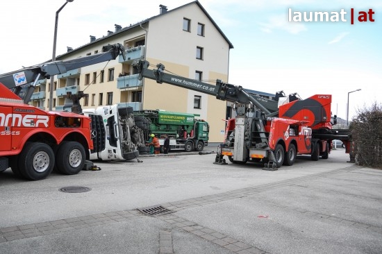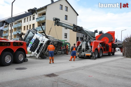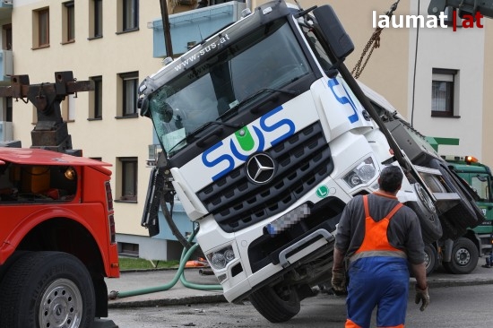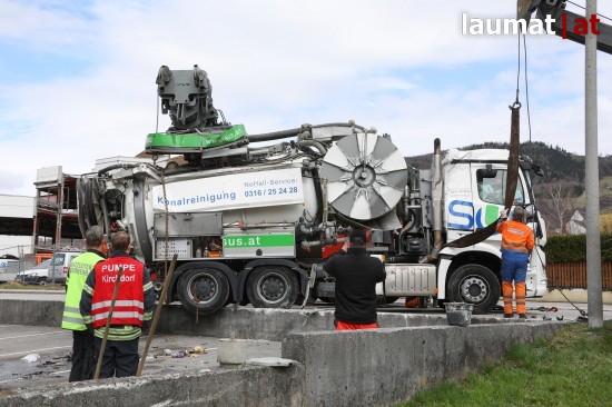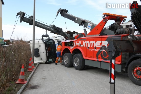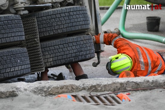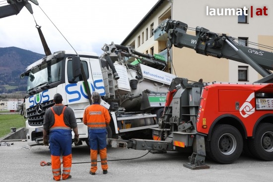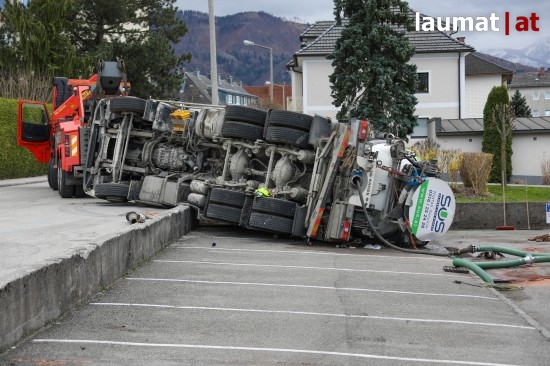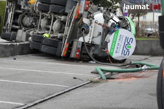 Der Lenker des Schwerfahrzeuges hat ersten Informationen zufolge Donnerstagfrüh offenbar bei einem Umkehrmanöver eine Mauerkante eines Parkplatzes übersehen und dachte es gehe eben weiter. Der LKW kippte über die Kante und stürzte daraufhin um. Der Lenker blieb bei dem Unfall unverletzt. Der Inhalt wurde abgesaugt und ein Spezialbergeunternehmen zur LKW-Bergung angefordert. Mit Hilfe von zwei Bergefahrzeugen gelang es schließlich das Fahrzeug wieder auf die Räder zu stellen. Die Feuerwehr stand bei den Aufräumarbeiten ebenfalls im Einsatz, da Betriebsmittel in einen Sickerschacht gelangt waren. Bindemittel musste zusätzlich aufgetragen werden. Ein Hydrologe wurde angefordert.