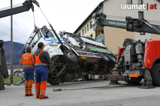 Schwierige Bergung eines umgestürzten Kanalreinigungsfahrzeuges in Kirchdorf an der Krems