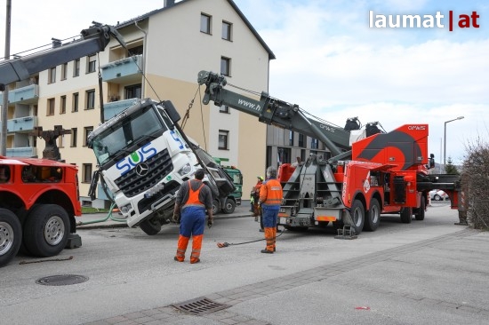 Kirchdorf an der Krems. Schwierig gestaltete sich am Donnerstag die Bergung eines umgestürzten Kanalreinigungsfahrzeuges in einem Siedlungsgebiet in Kirchdorf an der Krems.