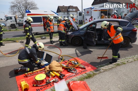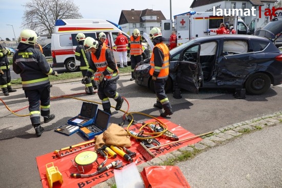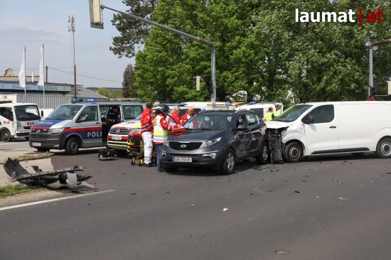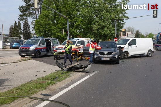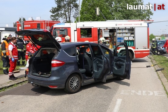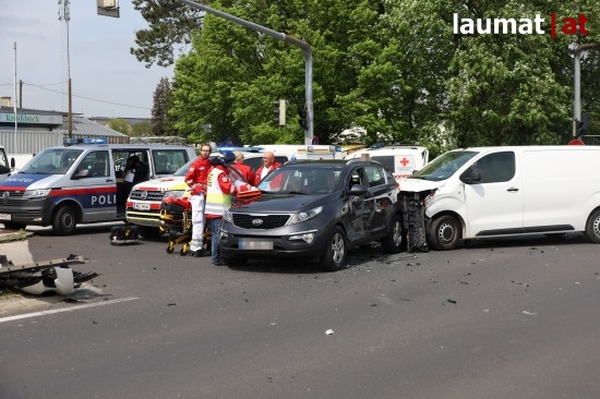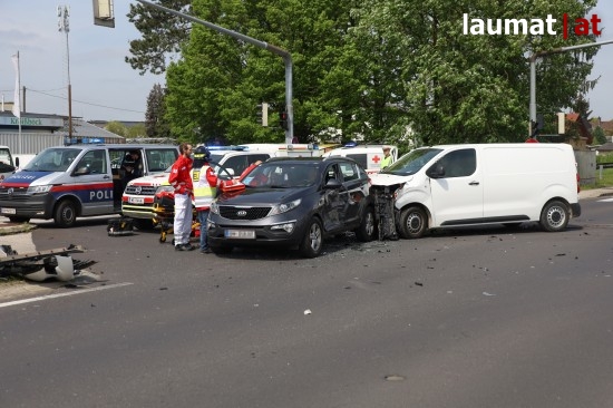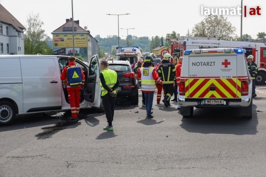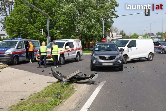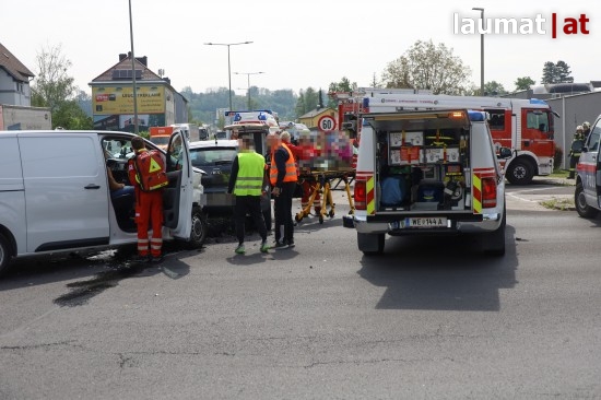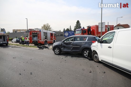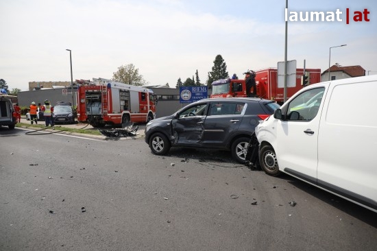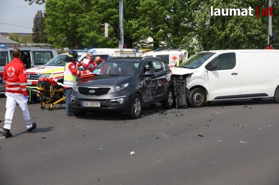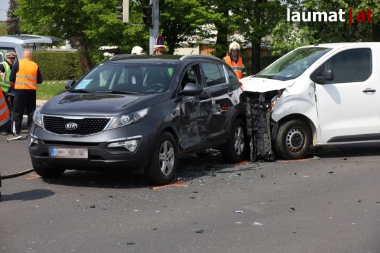 Wels. Sechs Verletzte hat Montagvormittag ein schwerer Kreuzungsunfall zwischen drei Fahrzeugen - einem Kleintransporter und zwei PKW - auf der B138 Pyhrnpass Straße in Wels-Pernau gefordert.