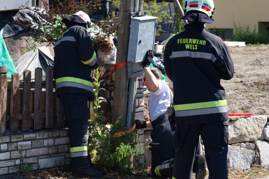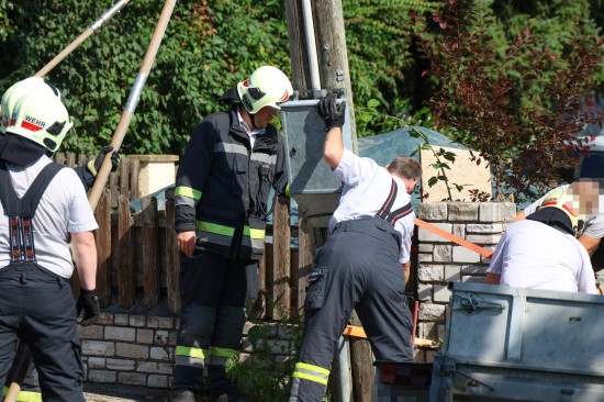 Wels. Einsatzkräfte der Feuerwehr und der Polizei standen Montagvormittag in Wels-Puchberg im Einsatz, nachdem ein Bagger einen Telefonmast zu Fall gebracht hat.