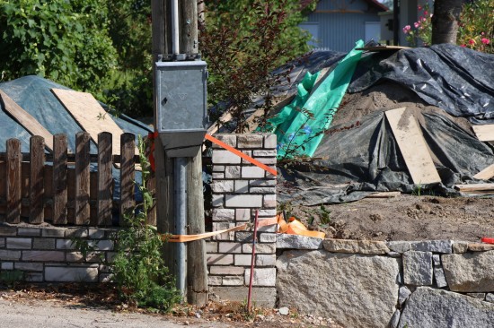 Der Bagger touchierte die Telefonleitung, woraufhin der Doppelmast umstürzte. Die Kräfte der Feuerwehr stellten den Mast wieder auf und sicherten ihn provisorisch mittels Gurten an einer Zaunsäule. Weitere Verständigungen wurden durchgeführt. Die Polizei nahm den Unfall auf.