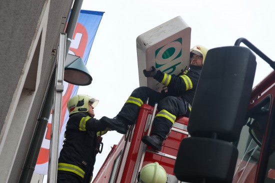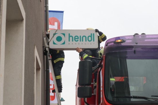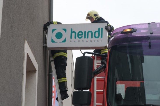 Ein LKW hat Dienstagnachmittag in Wels-Innenstadt die Leuchtreklame eines Geschäfts touchiert und so beschädigt, dass die Feuerwehr diese abmontieren musste.