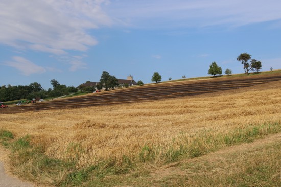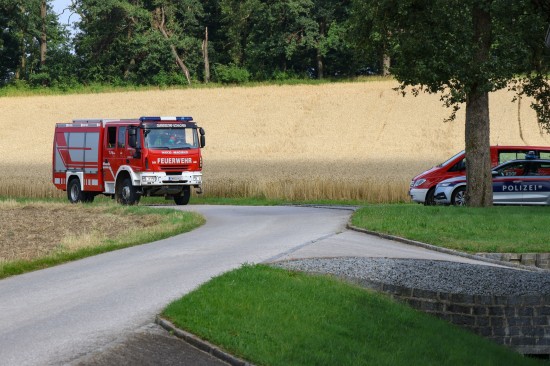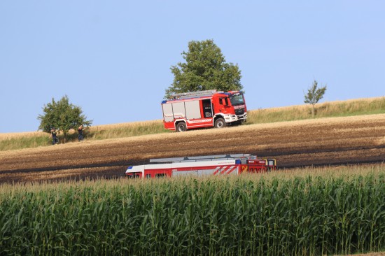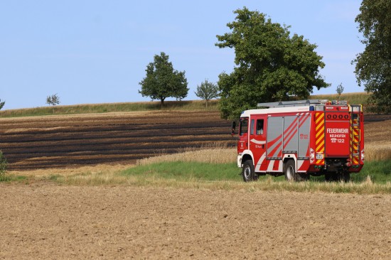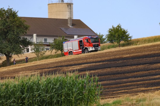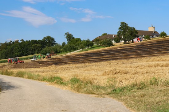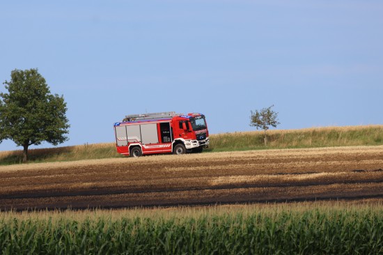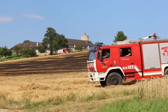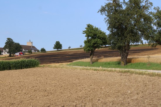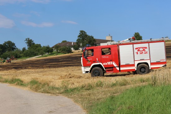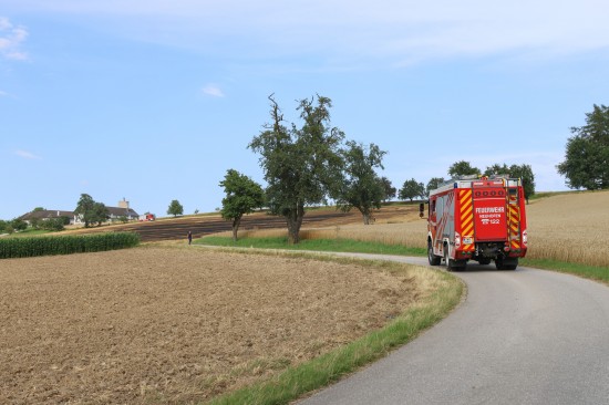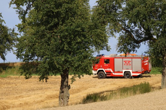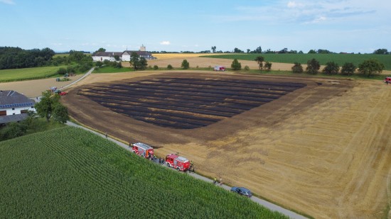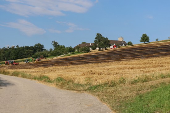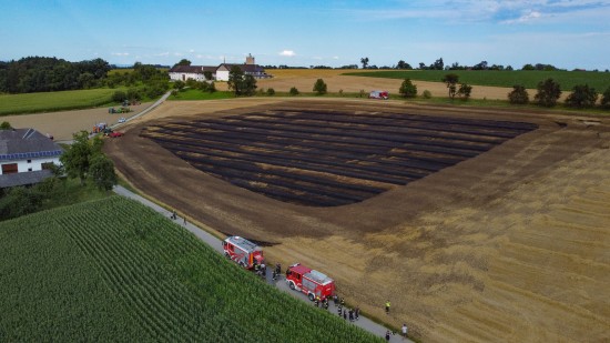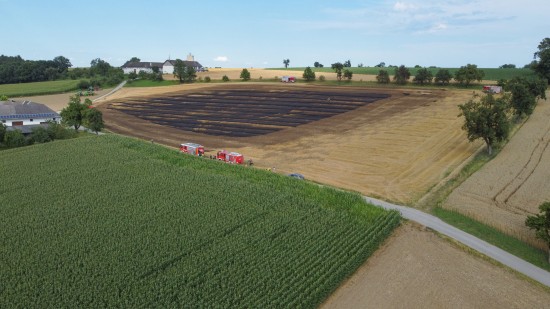 Bei Erntearbeiten dürfte es im Bereich einer Strohpresse zu einem Brand gekommen sein, welcher sofort das abgeerntete Feld erfasste. Die Feuerwehr rief Alarmstufe 2 aus, sieben umliegende Feuerwehren standen daraufhin im Löscheinsatz. Der Brand konnte vom Großaufgebot rasch unter Kontrolle gebracht werden. Landwirte unterstützten bei den Löschmaßnahmen. Verletzt wurde niemand.