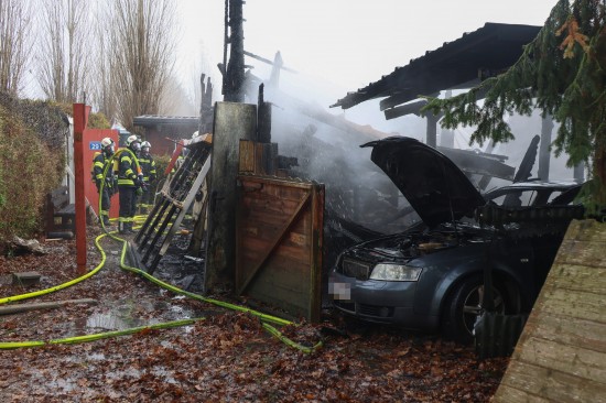 Die Einsatzkräfte der Feuerwehr wurden mit dem Einsatzbegriff "Brand Hütte" zu einem Brand eines Gebäudes in einer Anlage, welche auch als Campingplatz genutzt wird, alarmiert. Ein Kleingebäude - ähnlich einem Ferienhaus - stand dort in Vollbrand, ebenso brannte ein in einem Carport abgestellter PKW. Mit großem Einsatz zahlreicher Ersthelfer mit Feuerlöschern und einem raschen Löschangriff durch die eintreffenden Kräfte der alarmierten Feuerwehren konnte das Feuer soweit in Schach gehalten werden, dass ein Übergreifen der Flammen auf benachbarte Objekte erfolgreich verhindert werden konnte. Der Hausbesitzer wurde vom Rettungsdienst vor Ort betreut. Insgesamt standen sieben Feuerwehren im Einsatz. Die Polizei hat die Ermittlungen zur Klärung der Brandursache in die Wege geleitet.