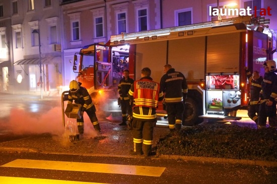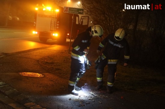 Nach einem Einsatz bei einem Müllinselbrand löschte die Feuerwehr in Wels-Vogelweide noch eine brennende Feuerwerksbatterie auf einem Gehsteig.