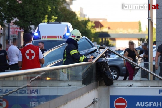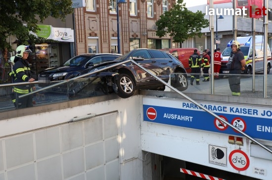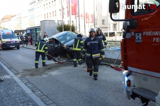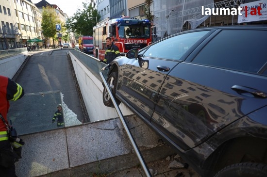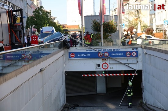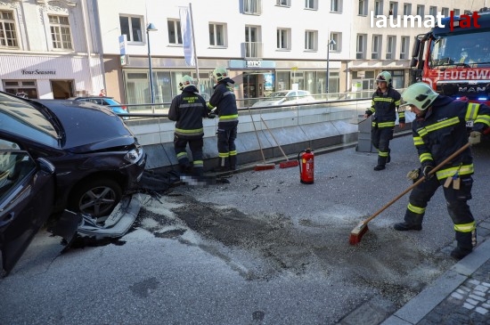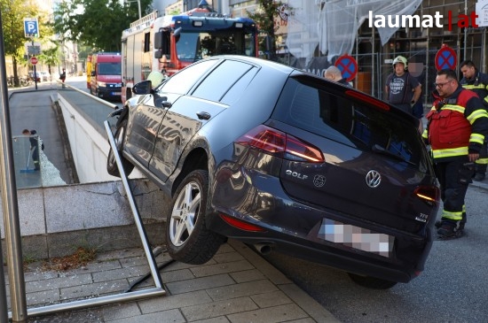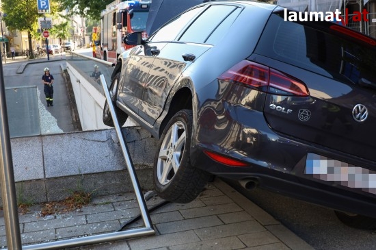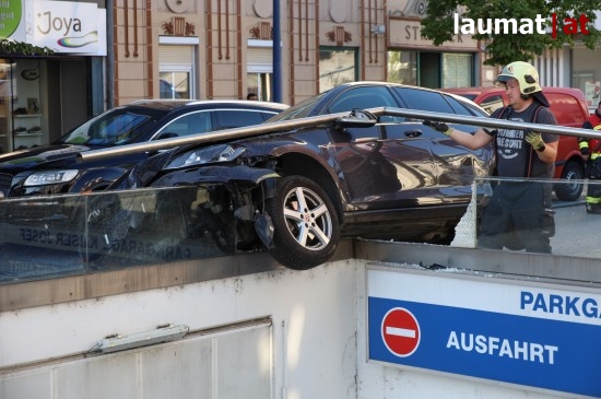 Wels. Ein spektakulärer Verkehrsunfall hat sich Samstagnachmittag in der Welser Innenstadt ereignet. Ein Auto landete dabei auf einer Brüstungsmauer über einer Tiefgaragenabfahrt.