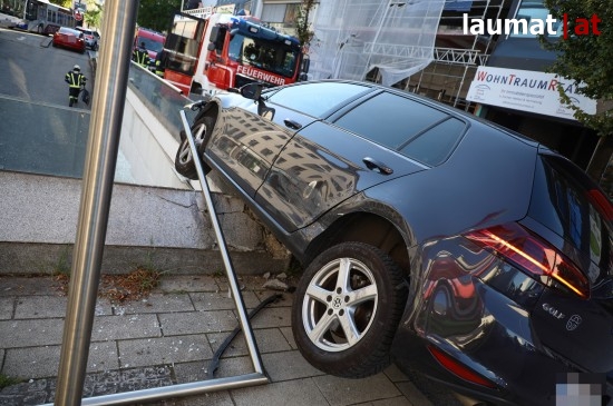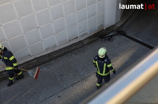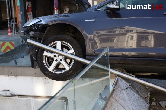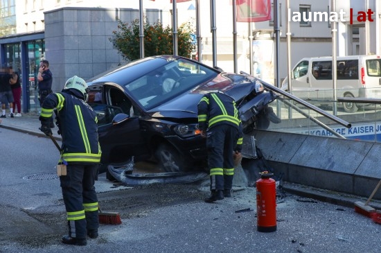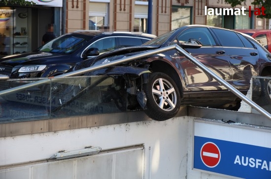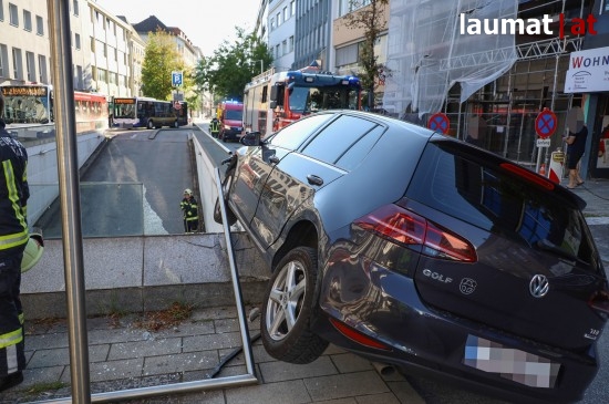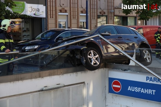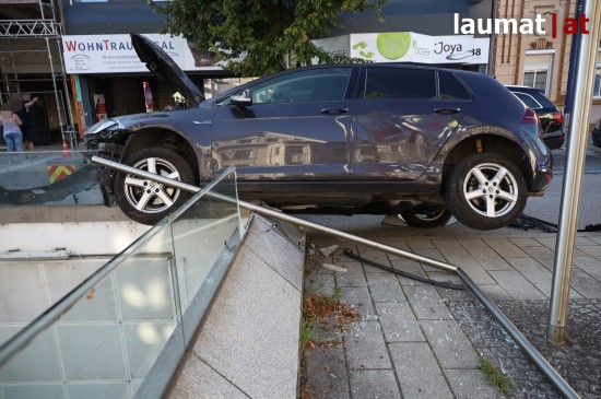 Ein spektakulärer Verkehrsunfall hat sich Samstagnachmittag in der Welser Innenstadt ereignet. Ein Auto landete dabei auf einer Brüstungsmauer über einer Tiefgaragenabfahrt.