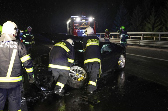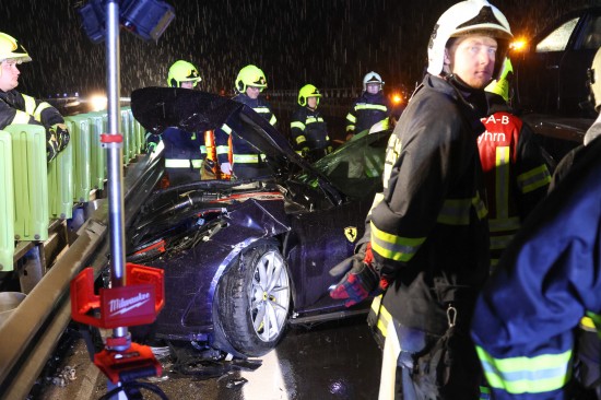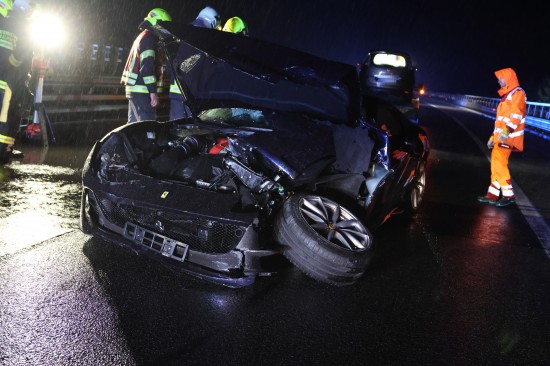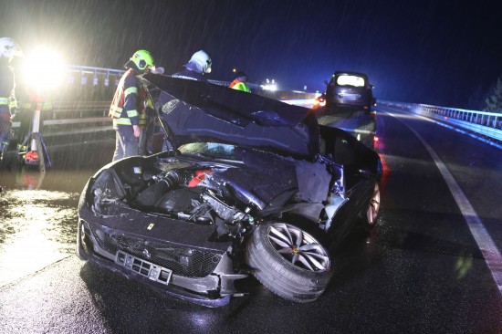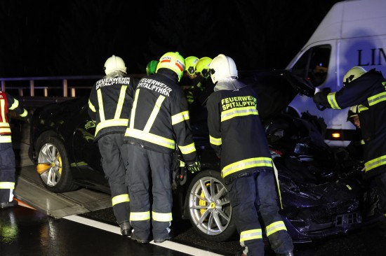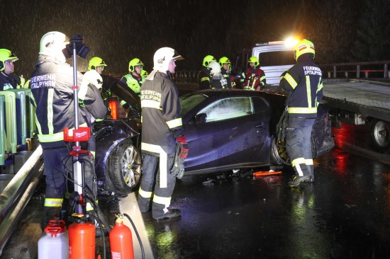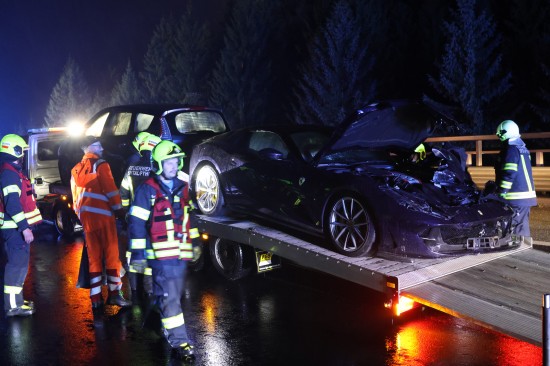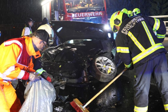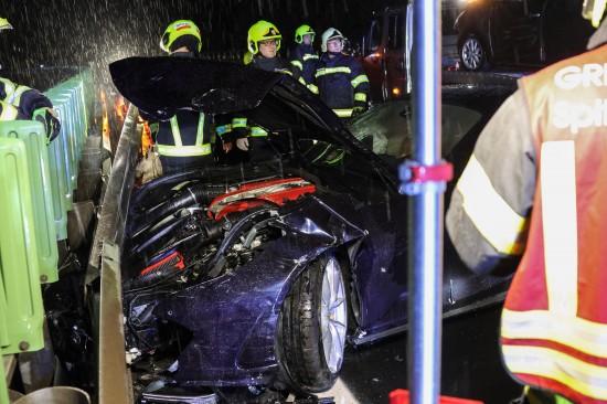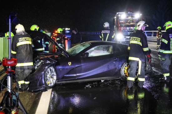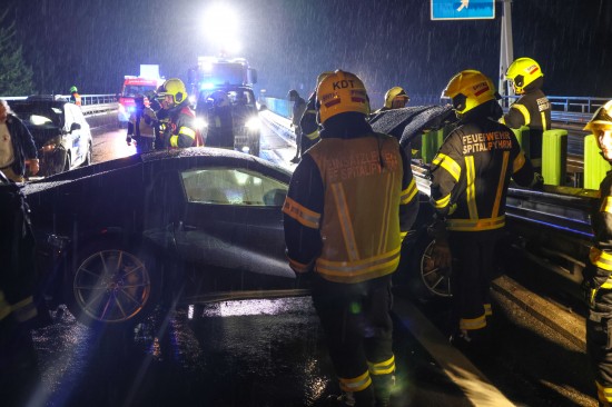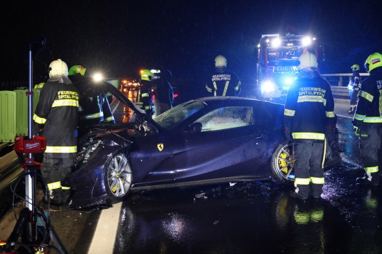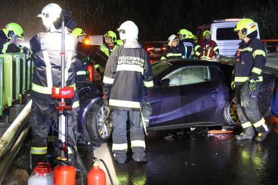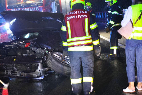 Der Unfall passierte am späten Donnerstagabend auf der A9 Pyhrnautobahn im Gemeindegebiet von Spital am Pyhrn. Aus noch unbekannten Gründen ist es auf regennasser Fahrbahn in Fahrtrichtung Graz, zwischen der Autobahnauffahrt Spital am Pyhrn und dem Bosrucktunnel beziehungsweise der Landesgrenze zur Steiermark, zu einem heftigen Crash gekommen. Die Einsatzkräfte zweier Feuerwehren wurden zur Personenrettung alarmiert, glücklicherweise war aber niemand im Fahrzeug eingeklemmt. Die Einsatzkräfte sicherten die Unfallstelle ab und führten in weiterer Folge die Aufräumarbeiten durch. Weil ein teurerer Sportwagen direkt in der Leitschiene steckte, wurde diese teilweise abmontiert, um das Fahrzeug schonend bergen zu können. Nachdem beide Unfallfahrzeuge auf den Abschleppwagen verladen waren, wurde die Fahrbahn noch von Splittern und Fahrzeugteilen befreit.