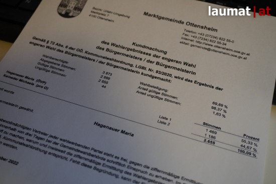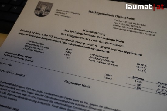 In Ottensheim (Bezirk Urfahr-Umgebung) wurde am Sonntag die Stichwahl um das Amt der neuen Bürgermeisterin abgehalten.