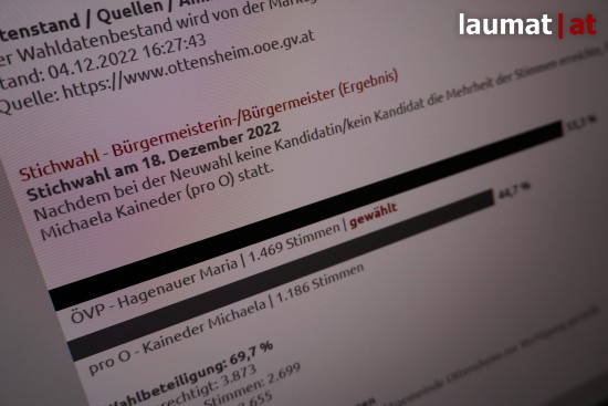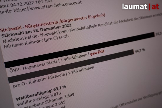 Nachdem im ersten Wahlgang vor zwei Wochen noch keine Kandidatin beziehungsweise kein Kandidat die notwendige Mehrheit der Wählerstimmen erreicht hatte, waren die 3.873 Einwohnerinnen und Einwohner am Sonntag erneut aufgerufen eine neue Bürgermeisterin zu wählen. Zur Wahl standen die zwei stimmenstärksten Kandidatinnen aus dem ersten Wahlgang Maria Hagenauer (ÖVP) und Michaela Kaineder (pro O).