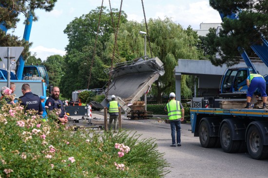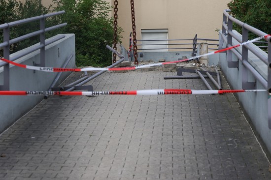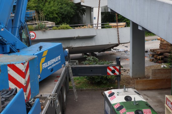 Ein folgenschwerer Unfall mit einem LKW hat sich am Mittwochvormittag in Linz-Kleinmünchen-Auwiesen ereignet. Ein LKW hat mit seinem Kran eine tonnenschwere Fußgängerbrücke umgerissen.