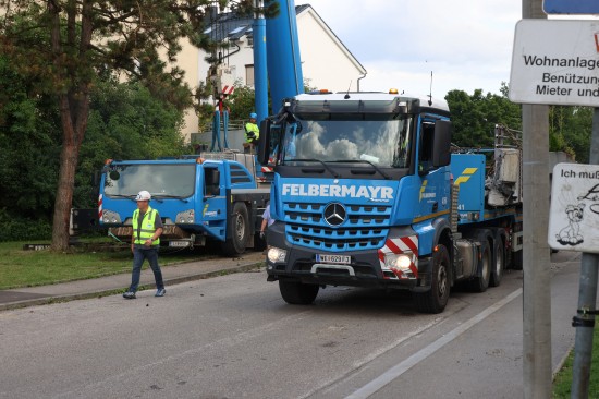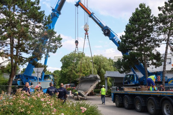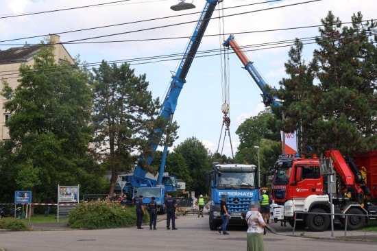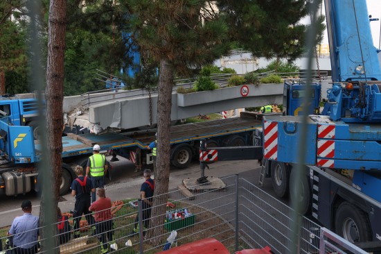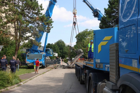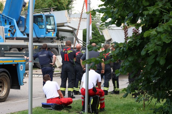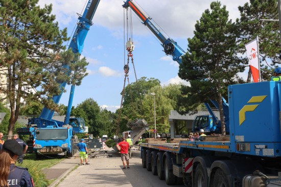 Der Unfall passierte am Mittwochvormittag im Linzer Stadtteil Kleinmünchen-Auwiesen. Ein LKW mit Kran wollte offenbar auf einer Straße in einer Wohnanlage unter einer Fußgängerbrücke durchfahren, dabei touchierte das Schwerfahrzeug mit dem Kran die Brücke, welche aus der Verankerung gerissen wurde und auf den LKW stürzte. Der Lenker und sein Beifahrer waren stundenlang eingeklemmt. Erst nach ersten Absicherungsmaßnahmen und dem Einsatz mehrerer Kräne konnten die Personen geborgen werden, heißt es. Am Nachmittag war immer noch ein Großaufgebot am Einsatzort, um die Brücke abzutransportieren. Mit riesigen Autoschwerlastkränen wurden sie dann auf einen Tieflader verladen und unter Polizeibegleitung abtransportiert.