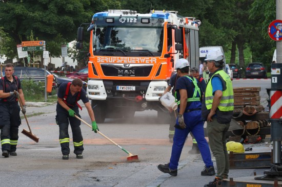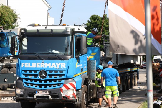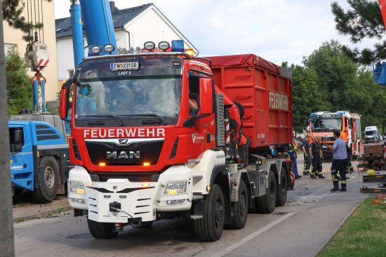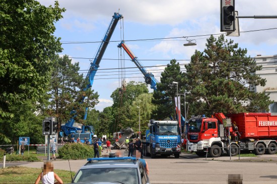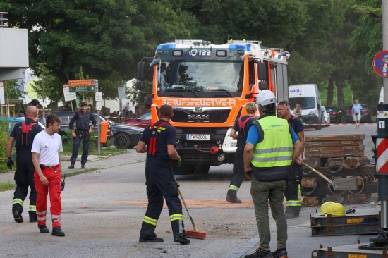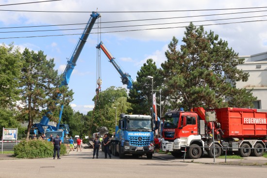 Stundenlang eingeklemmt: Tonnenschwere Brücke in Linz-Kleinmünchen-Auwiesen auf LKW herabgestürzt