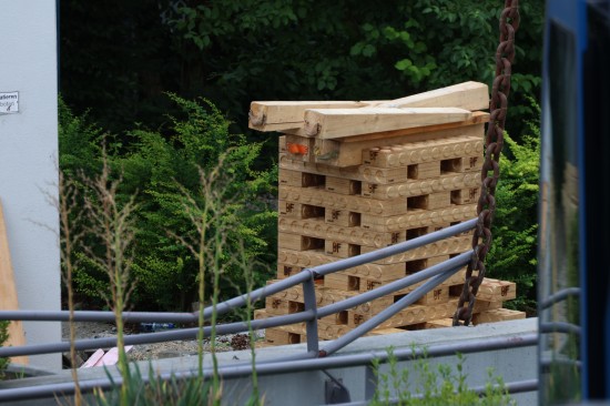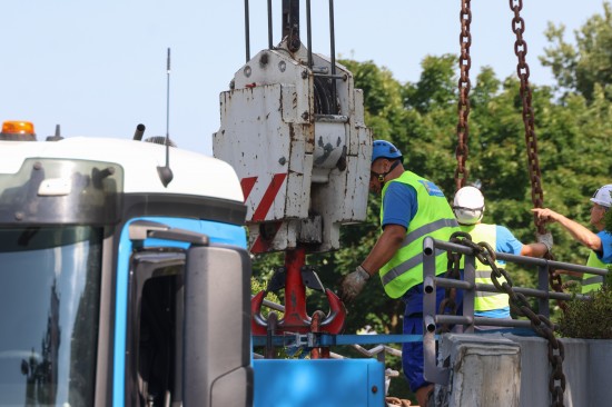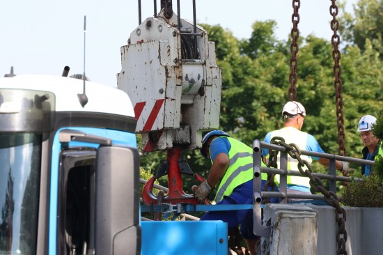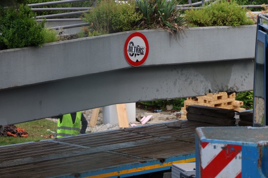 Fußgängerbrücke mit LKW-Kran aus Verankerung gerissen