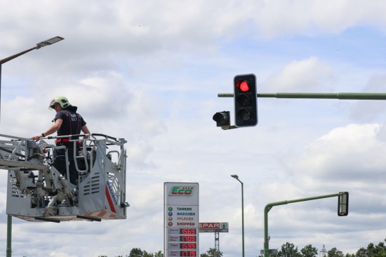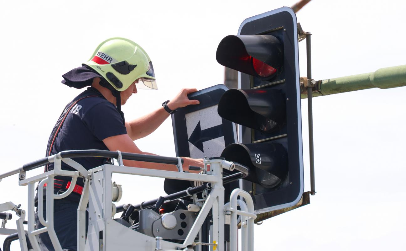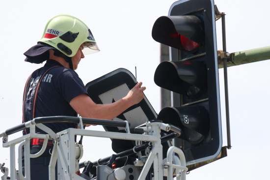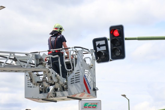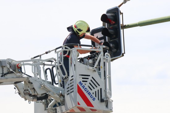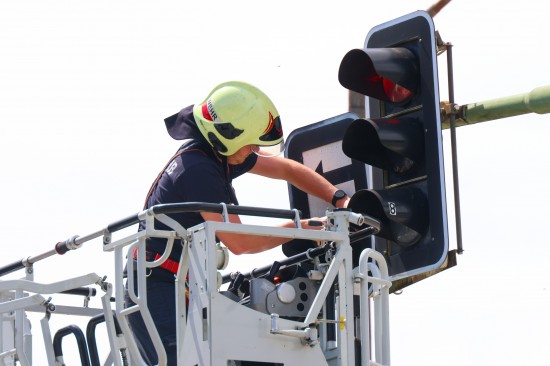 Die Verkleidung einschließlich Zusatztafel einer Überkopfampel an der Kreuzung der Grieskirchner Straße mit der Oberfeldstraße im Welser Stadtteil Neustadt dürfte sich vermutlich aufgrund der stärkeren Windböen in Verbindung des offensichtlich fortgeschrittenen Alters der Ampelanlage gelöst haben. Die Feuerwehr entfernte das betroffene Bauteil mittels Drehleiter.