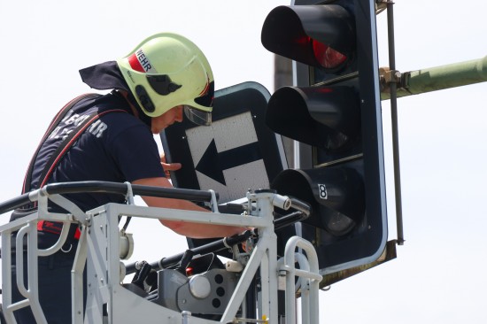Eine Zusatztafel an einer Verkehrslichtsignalanlage - besser bekannt als Verkehrsampel - in Wels-Neustadt drohte Samstagnachmittag abzustürzen.
