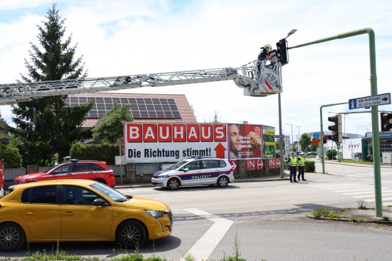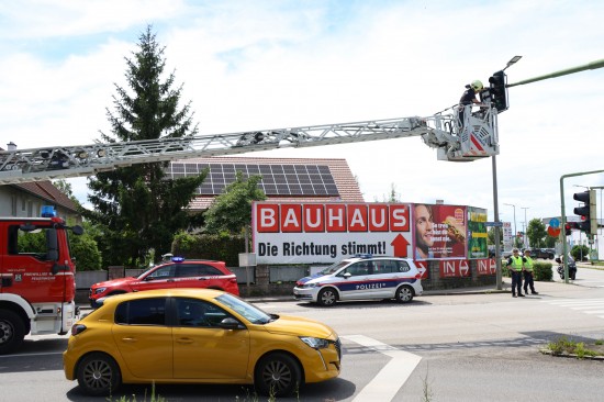 Sturmschaden: Zusatztafel einer Verkehrsampel in Wels-Neustadt drohte abzustürzen