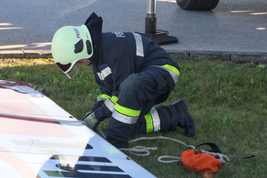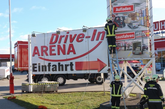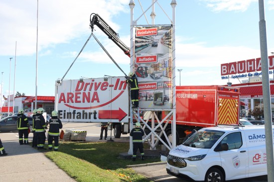 Durch die Sturmböen löste sich in Wels-Neustadt eine Werbe- beziehungsweise Hinweistafel bei der Einfahrt zu einem Baumarkt. Die Feuerwehr rückte zur Demontage mit einem Kran an. Nachdem ein Techniker des Notdienstes die Stromleitungen abgeklemmt hatte, wurde die Werbetafel umgelegt.