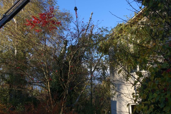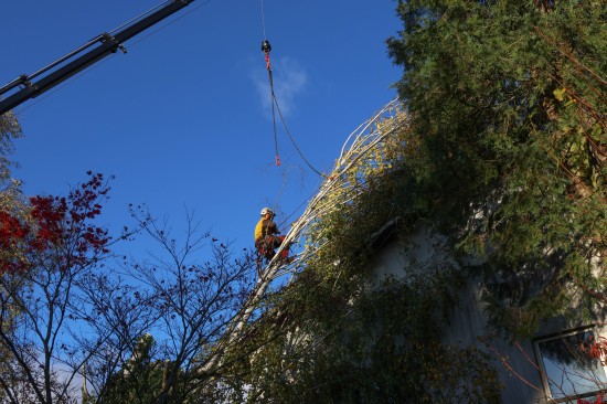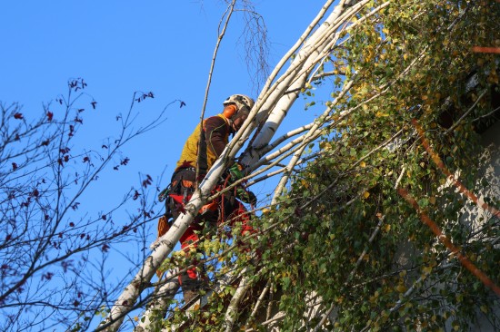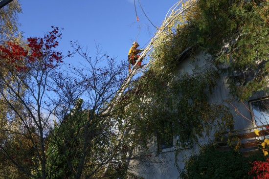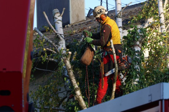 Eine Birke ist am Freitagnachmittag in Wallern an der Trattnach (Bezirk Grieskirchen) auf ein Haus gestürzt. Der Baum wurde im Dachbereich dann stückweise abgetragen. Mit dem Kran konnte der Stamm dann vom Haus gehoben werden. Verletzt wurde niemand.