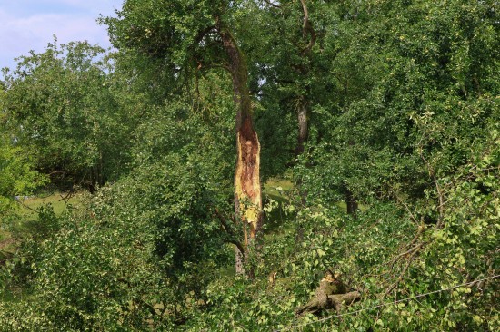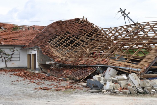 Gebäude teilweise eingestürzt, Dächer weggefegt, Bäume geknickt