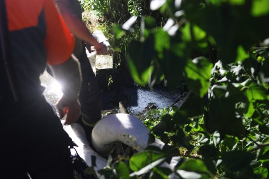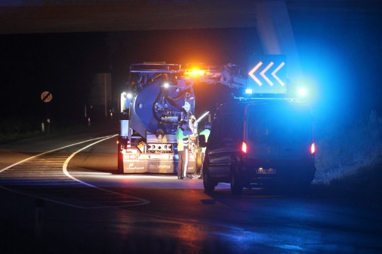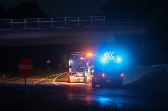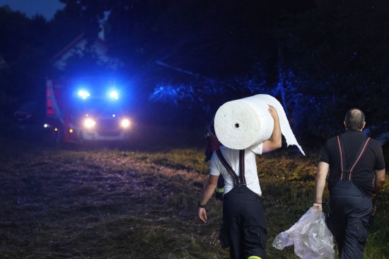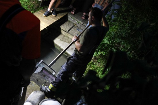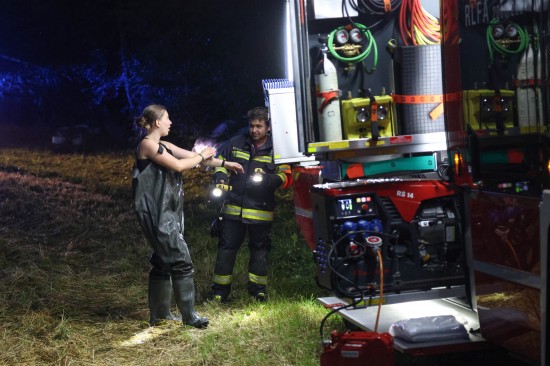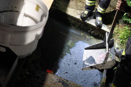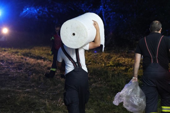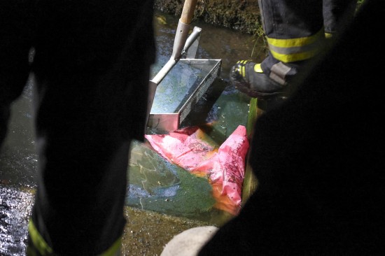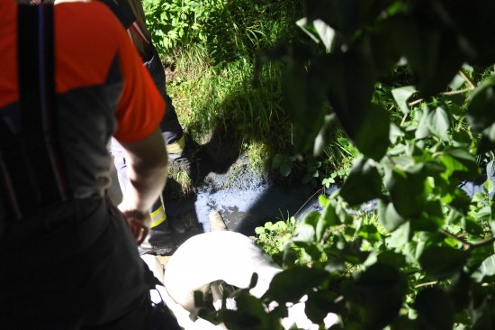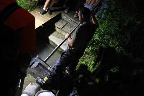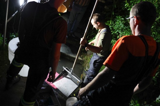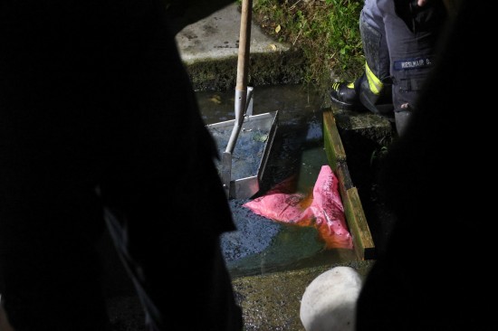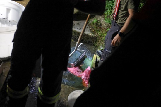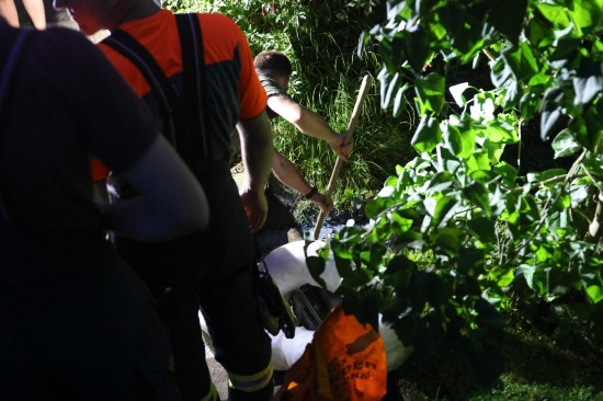 Die Einsatzkräfte wurden zu einem "Ölaustritt Gewässer" nach Pichl bei Wels alarmiert. In der Ortschaft Geisensheim wurde eine größere Menge Diesel in einem kleinen Bach - einem Innbach-Zubringer- entdeckt. Zeitgleich zum ersten Errichten einer Ölsperre wurde damit begonnen, den Ursprung des Diesels ausfindig zu machen. Nach und nach stellte sich heraus, dass der Diesel aus dem Bereich der A8 Innkreisautobahn nach einem heftigen Regenschauer in den kleinen Bachlauf gelangt sein dürfte. Die Vermutung lag nahe, dass es sich um Diesel handelte, der am vergangenen Freitag aus einem umgestürzten LKW-Sattelzug ausgetreten ist und offenbar in den Schächten neben der Unfallstelle nicht lokalisiert werden konnte. Die Einsatzkräfte streuten Bindemittel aus, schöpften dieses wieder ab und legten weitere Ölsperren und Bindevlies aus. Kräfte der ASFINAG reinigten Abflussschächte und Rohrleitungen, dabei kamen auch mehrere Saugwägen zum Einsatz.