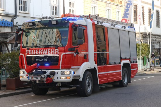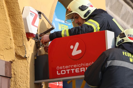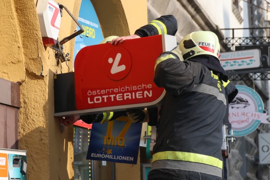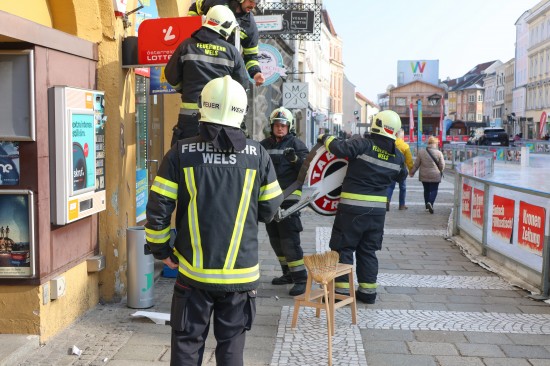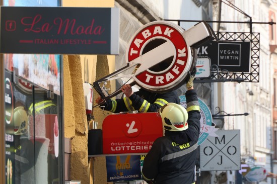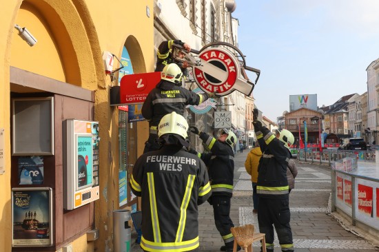 Ein LKW hat Dienstagvormittag in der Welser Innenstadt die Leuchtreklamen einer Trafik touchiert und so teilweise aus der Verankerung gerissen. Die Feuerwehr stand im Einsatz.