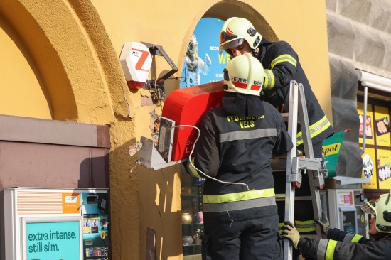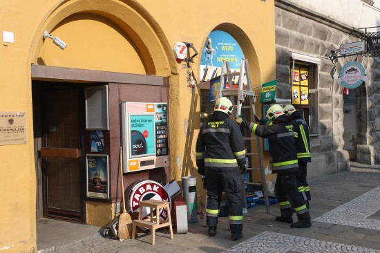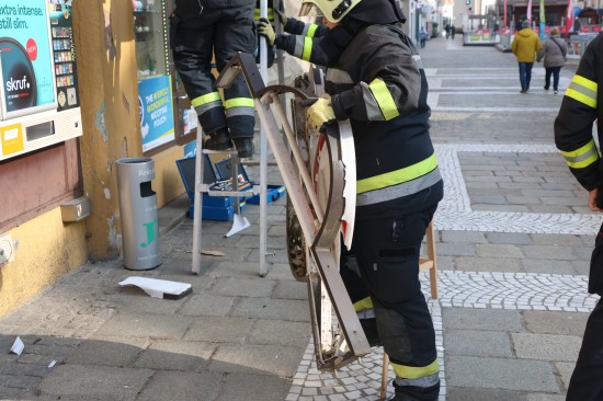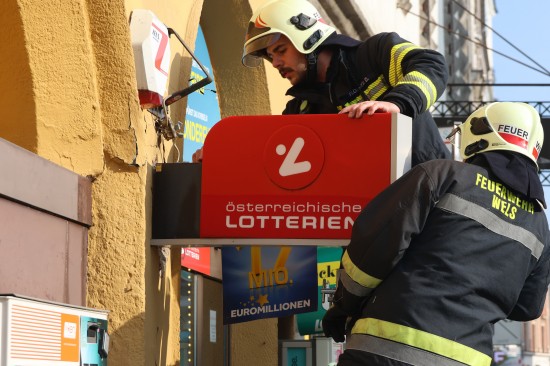 Verkehrsunfall: Beschädigte Leuchtreklamen einer Trafik in Wels-Innenstadt von Feuerwehr demontiert