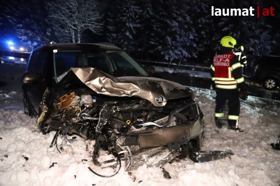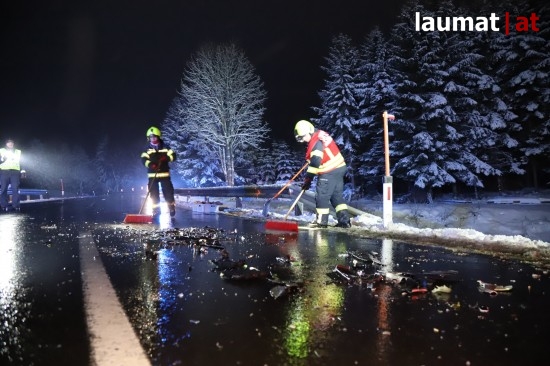 Ein Fahrzeug wurde bei dem Zusammenstoß in eine angrenzende Wiese geschleudert, bis es im Schnee zum Stillstand kam. Die Feuerwehr führte die Bergungsarbeiten durch und reinigte anschließend die Fahrbahn.