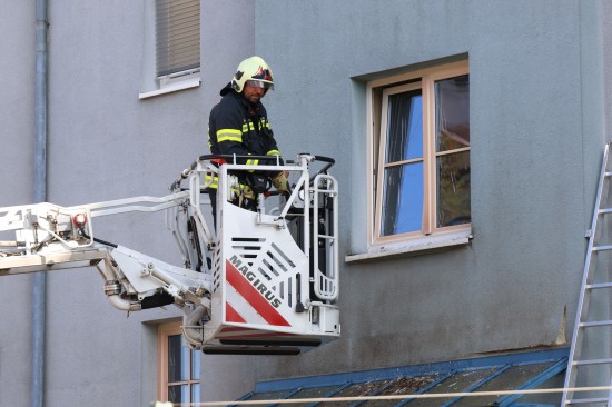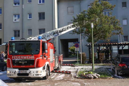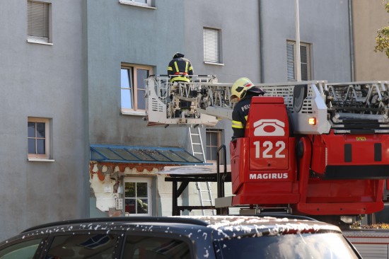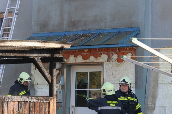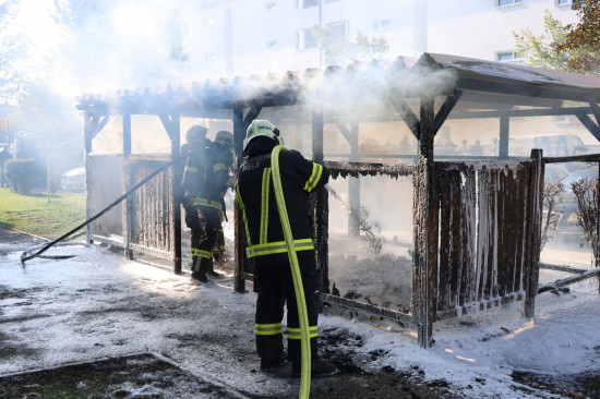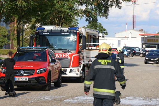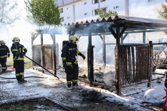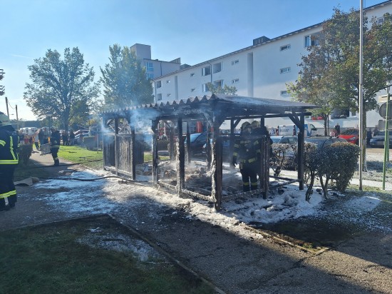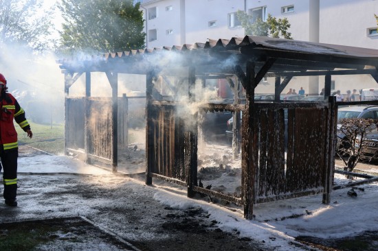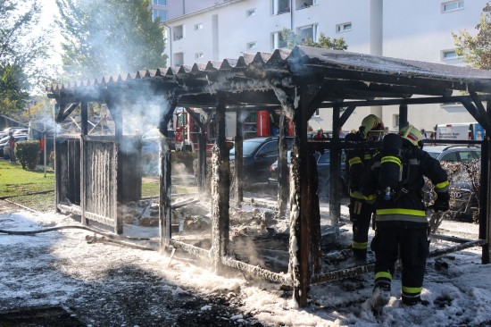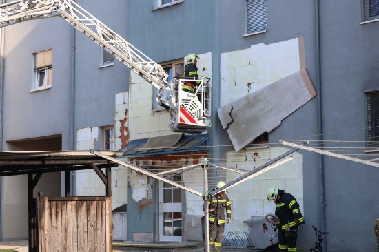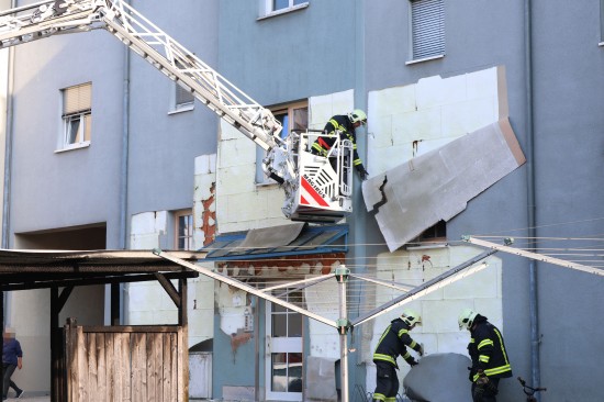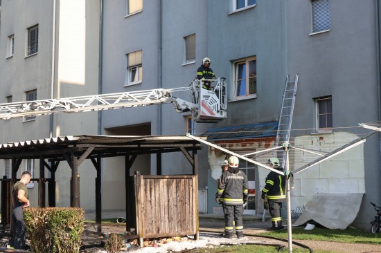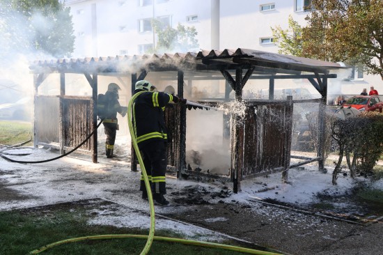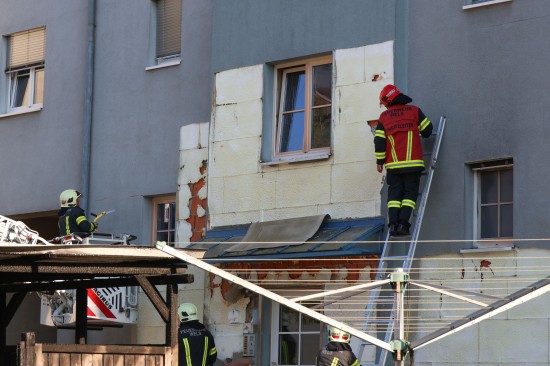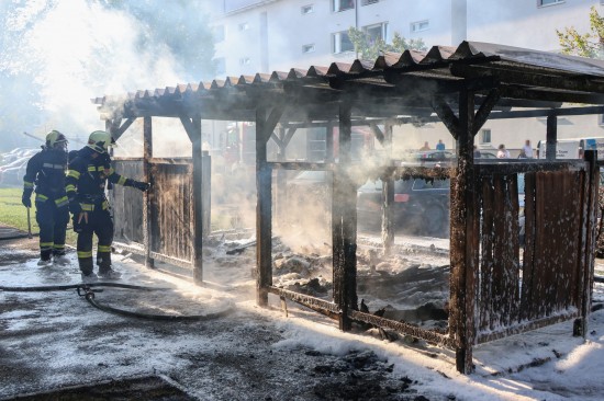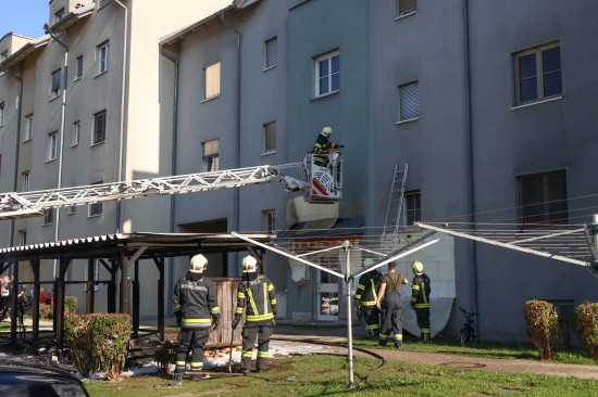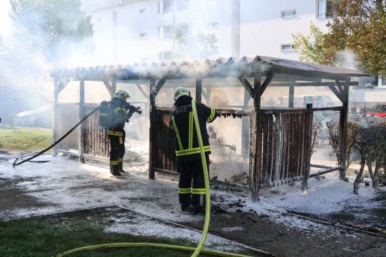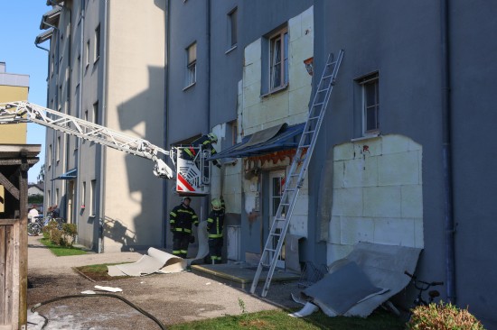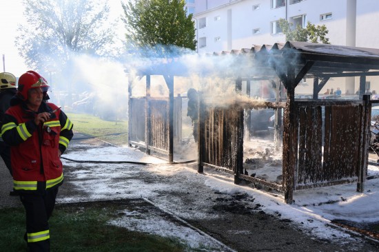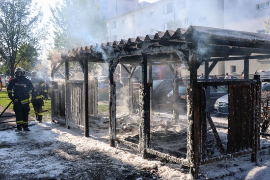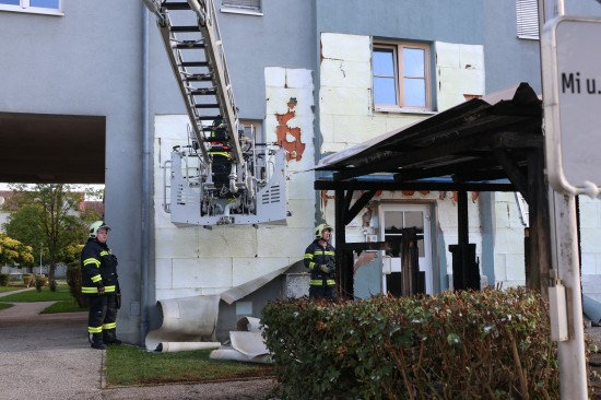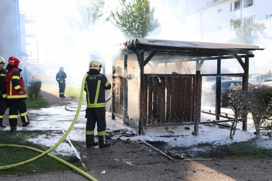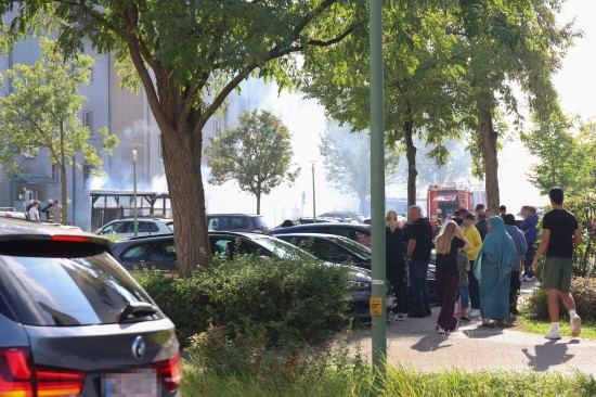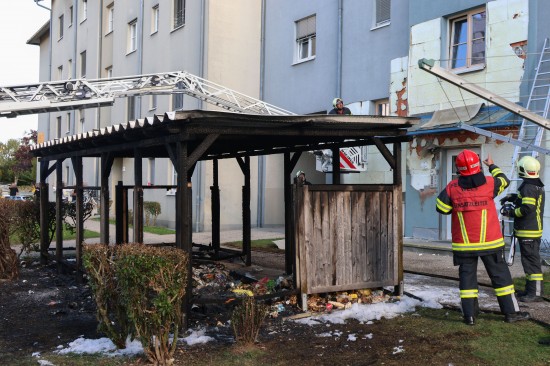 Vollbrand einer Müllinsel: Fassade sowie vier PKW bei größerem Brand in Wels-Neustadt beschädigt