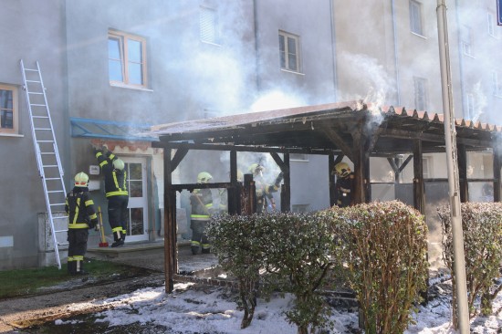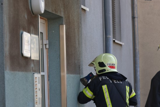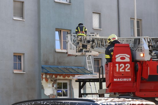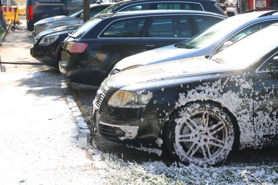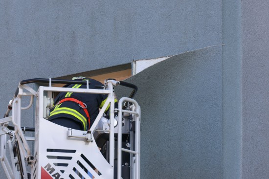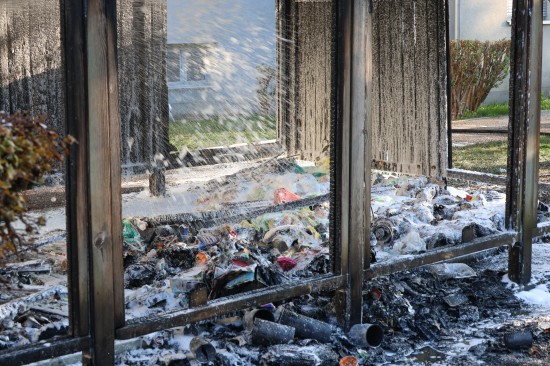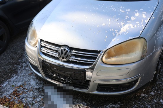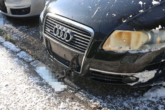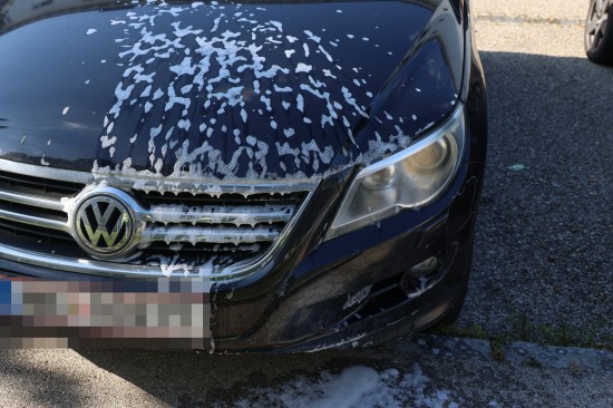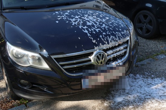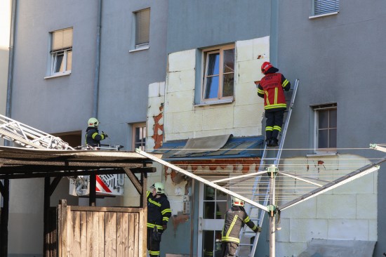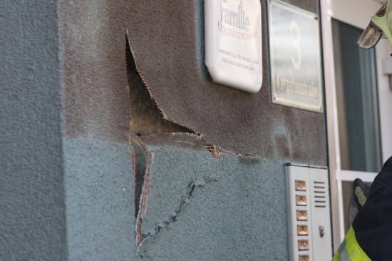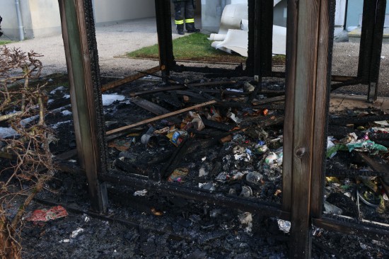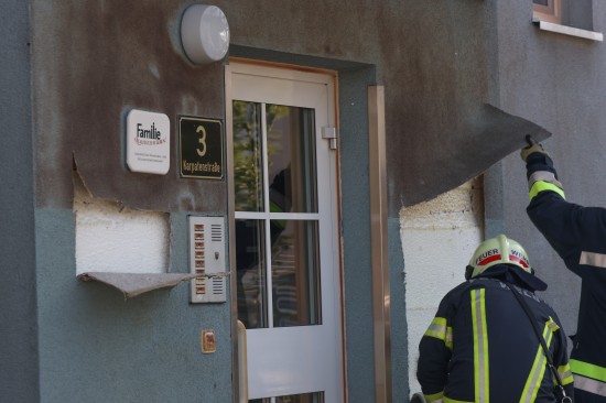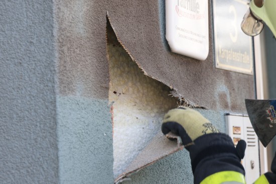 Zahlreiche Notrufe und eine größere Rauchsäule lotsten Samstagnachmittag die Einsatzkräfte der Feuerwehr zu einem ausgedehnten Brand einer Müllinsel vor einer Wohnanlage in Wels-Neustadt. Vor einem Mehrparteienwohnhaus stand beim Eintreffen der Feuerwehr eine Müllinsel bereits in Vollbrand. Die Kräfte der Feuerwehr konnten den Brand zwar rasch eindämmen, durch die enorme Hitze hatten allerdings auch das Gebäude selbst und vier vor dem Gehsteig abgestellte PKW bereits teils erheblichen Schaden genommen. Nachdem der Brand soweit unter Kontrolle war, wurde die Fassade des Wohngebäudes geöffnet. Dort waren mehrere Fenster gesprungen und leichte Schäden von außen sichtbar. Nach dem Öffnen der Fassade zeigte sich jedoch erst das wahre Ausmaß des Schadens. Der Vollwärmeschutz war an mehreren Stellen hinter dem Putz bereits vollständig geschmolzen. Die Fassade wurde im betroffenen Bereich geöffnet und mittels Wärmebildkamera kontrolliert. Schäden entstanden auch an Fenstern, der Haustüre, Beleuchtung und Klingelanlage. Die Müllsammelinsel ist ein Totalschaden. Vier PKW, die im betroffenen Bereich geparkt waren, wurden durch die Hitze teils ebenfalls schwer beschädigt. Plastikteile wie Leuchten, Kennzeichenhalter, Stoßstangen sind geschmolzen. Die Polizei hat die Ermittlungen aufgenommen. Ein Brandermittler sowie ein Spurensicherer waren vor Ort. Verletzt wurde niemand.
